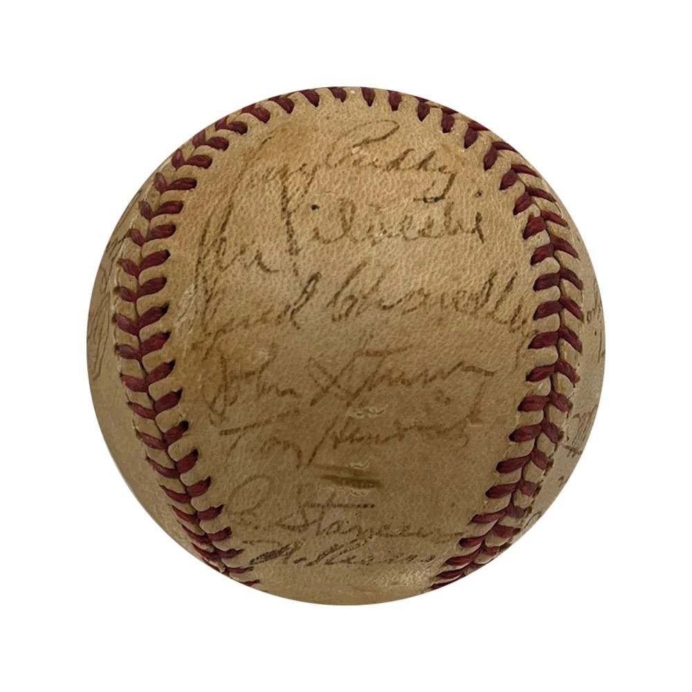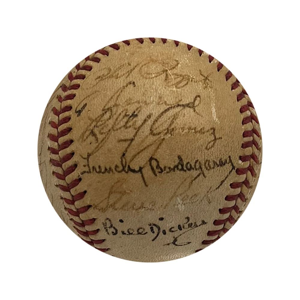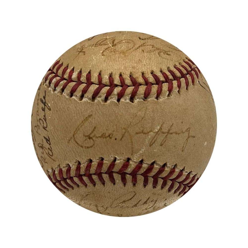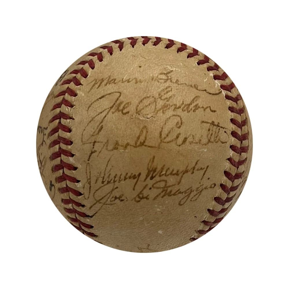 his antique baseball has been signed by members of the 1941 World Series Champion New York Yankees. The 1941 season is famously remembered for Joe DiMaggio's 56-game hitting streak, an MLB record that still stands to this day. Along with Joe DiMaggio's (HOF) signature, the ball also includes 23 others from that memorable team including Red Ruffing (HOF), Joe Gordon (HOF), Phil Ruzzuto (HOF), Lefty Gomez (HOF), Bill Dickey (HOF), Frankie Crosetti, Johnny Murphy, Marvin Breuer, Jerry Priddy, Ken Silvestri, Spud Chandler, Johnny Sturm, Tom Henrich, Charley Stanceu, Art Fletcher, Tiny Bonham, Charlie Keller, Norm Branch, Red Rolfe, Atley Donald, Frenchy Bordagaray, and Steve Peek. A rare World War 2 era treasure.