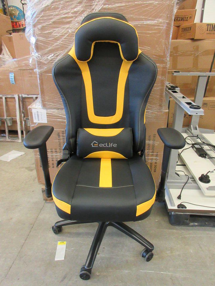 Black and Yellow PU Leather. Vibrating lumbar cushion. Removable headrest. Tilting. Model: OF-D05YE-M. Unassembled in box.