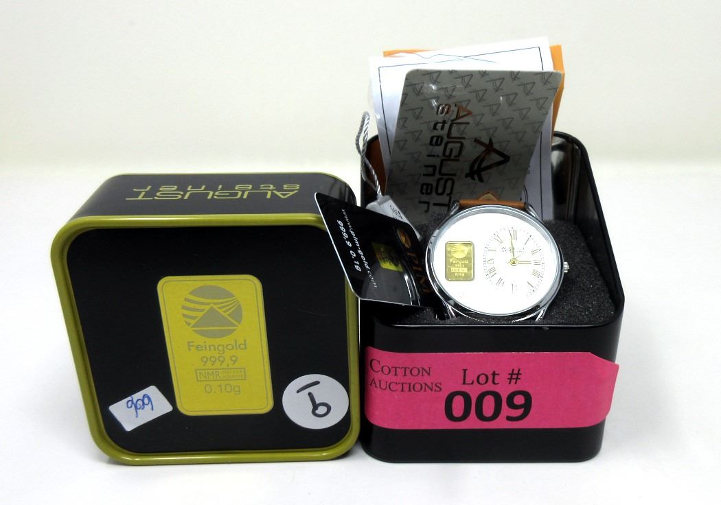 With genuine 0.10 gram .9999 gold bar. Includes $395 US tags & warranty card.