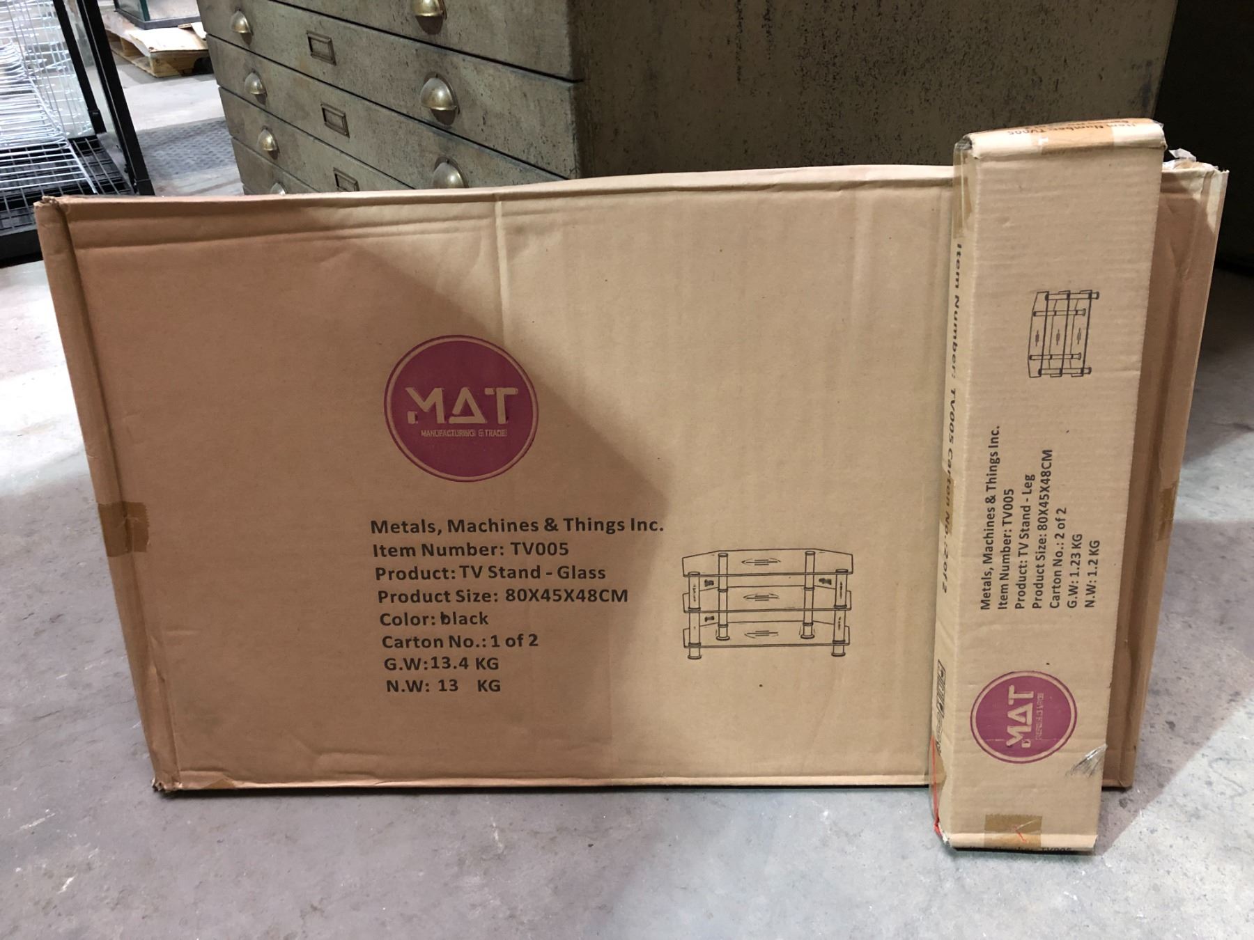 New in box black metal 3 tier w/ glass shelves TV entertainment stand (2 box set)