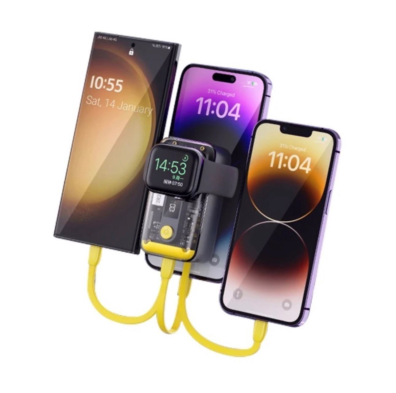 - Charge 4 devices at once! Fits apple watch around powerbank perfectly for easy charging/built-in integrated magnetic Apple watch charger; also has built-in USB-C and lightning charging cables!! VERY convenient!