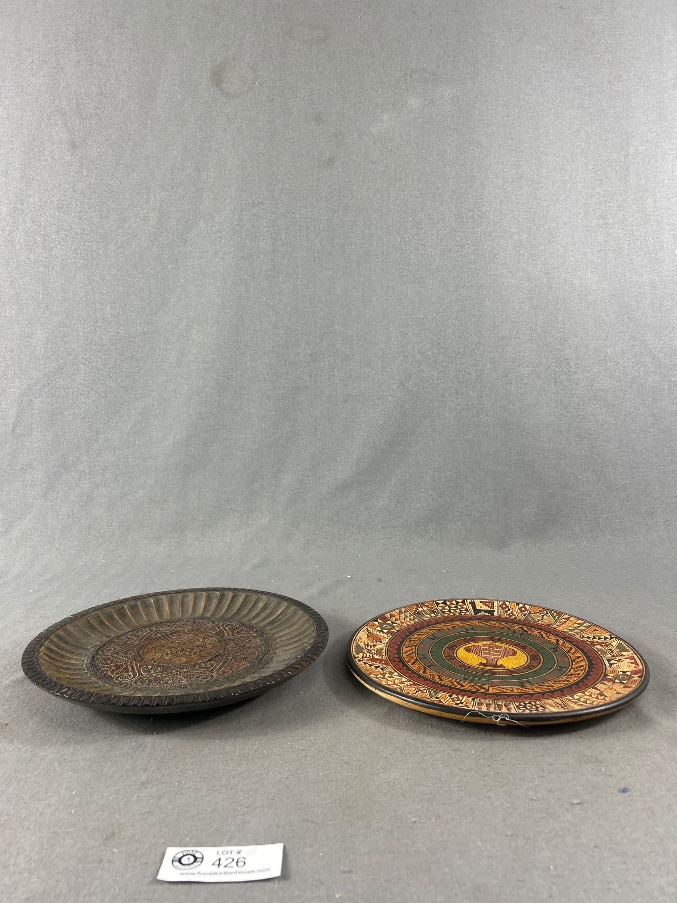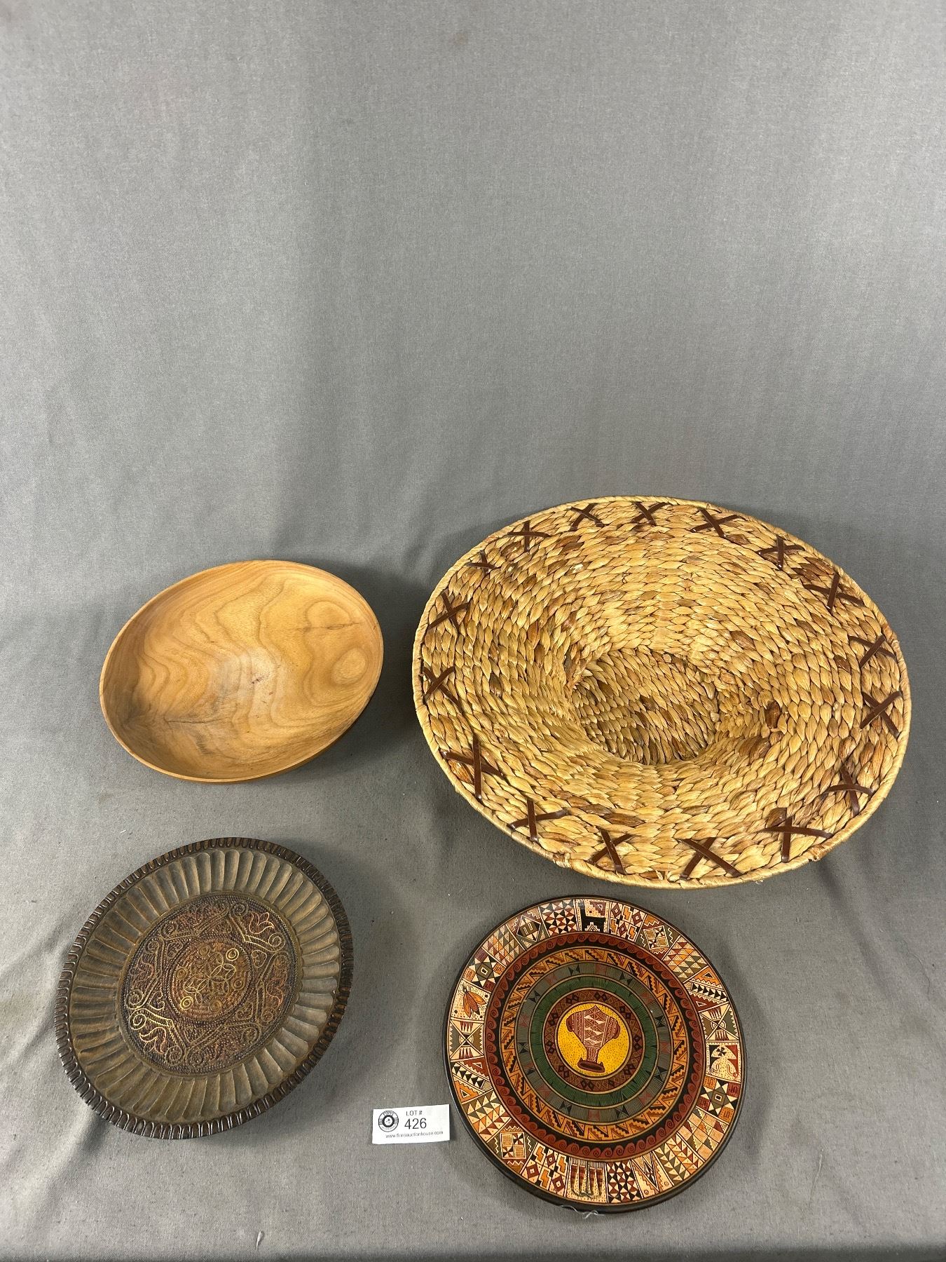 Nice Exotic Asian Décor Lot - 3 Wood Plates (2 Have Detailed Art) & 19" Diam. Rattan Bowl