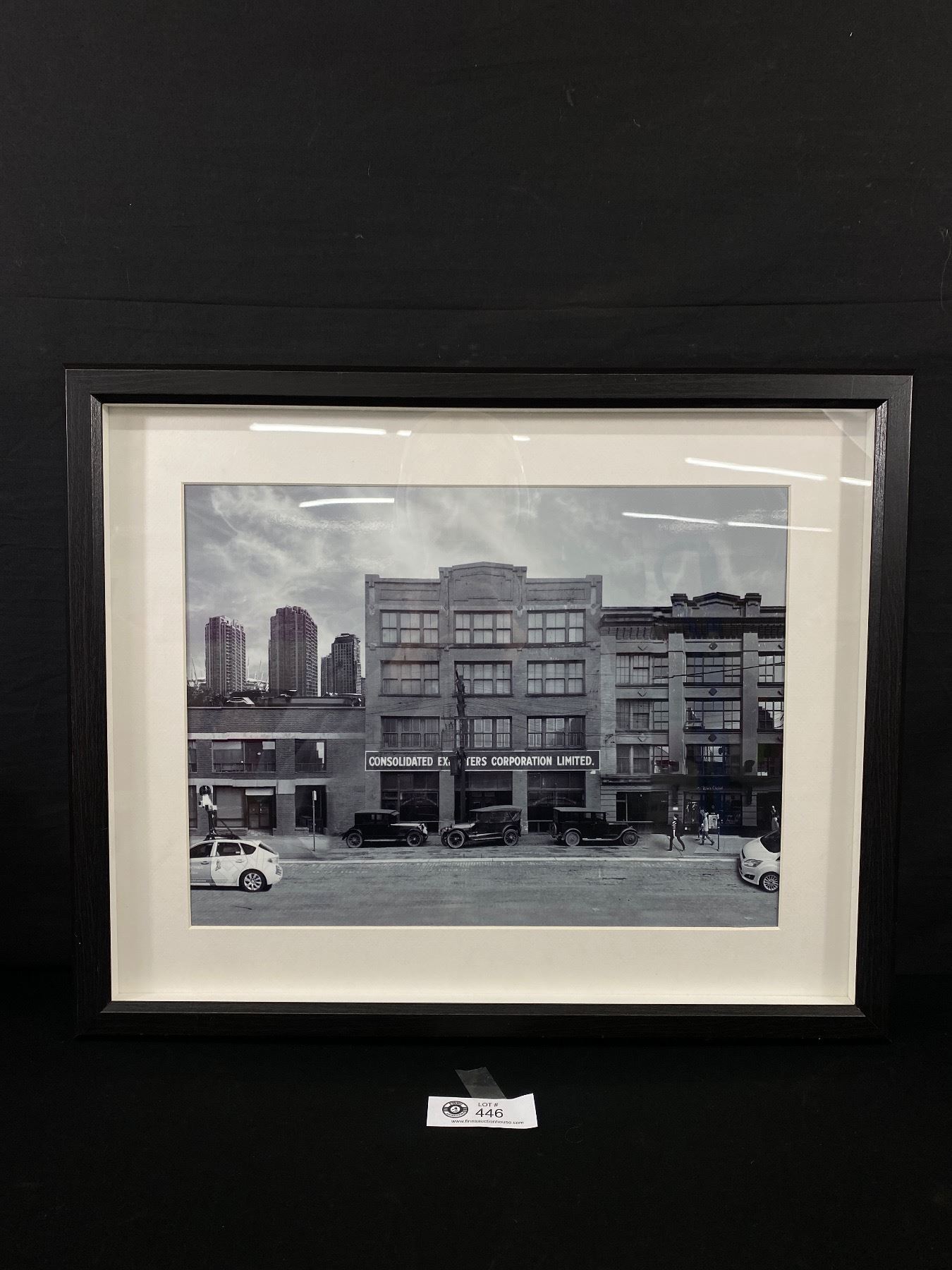 Nice Framed Black & White Digital Montage Of Consolidated Exporters Ltd Warehouse, Vancouver BC "Then & Now" By Jason Vanderhill. Approx. 21" H x 17 1/2" W