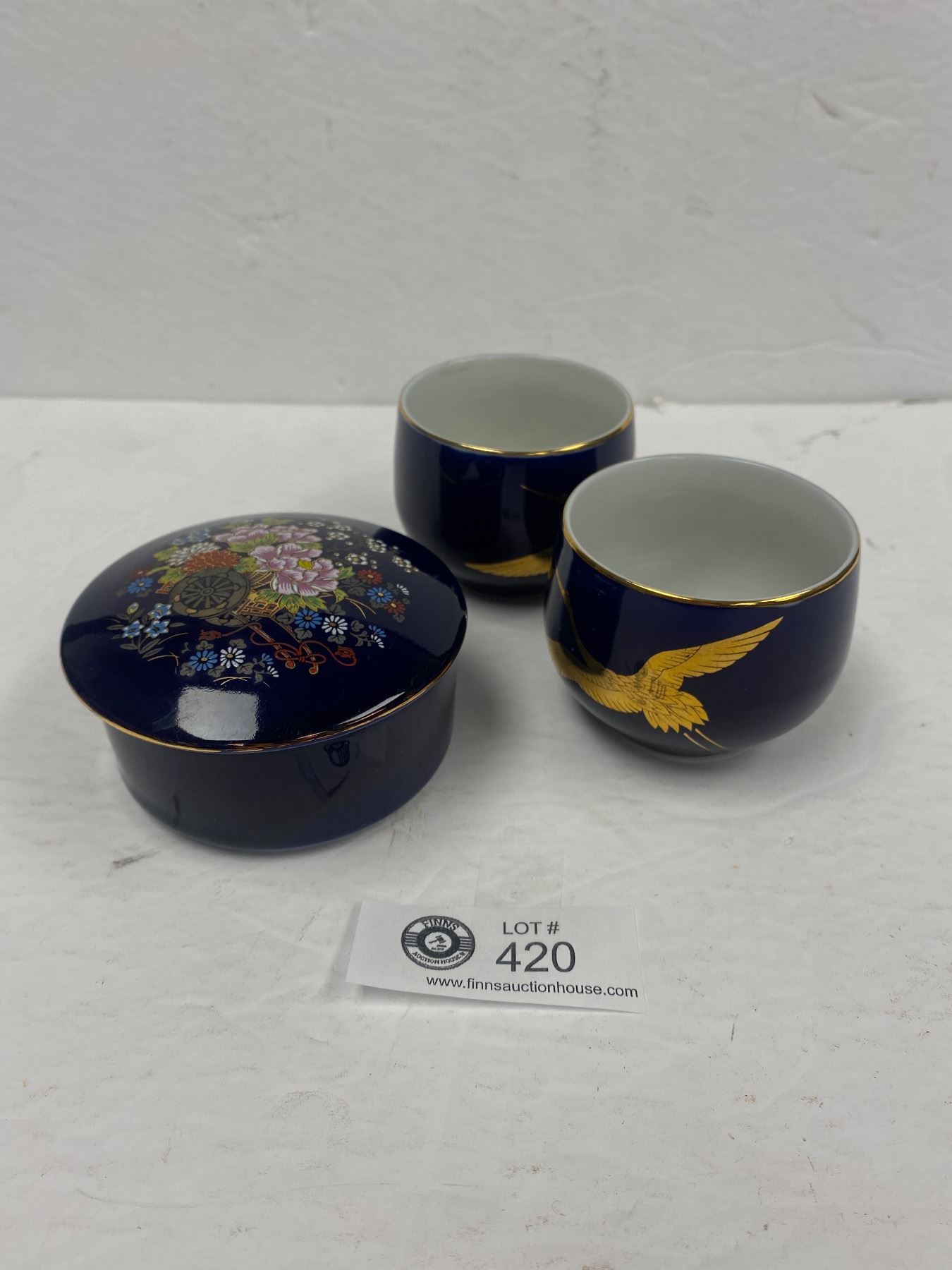 Nice Hand Painted Blue Trinket Box +24k Gold Rimmed Cups
