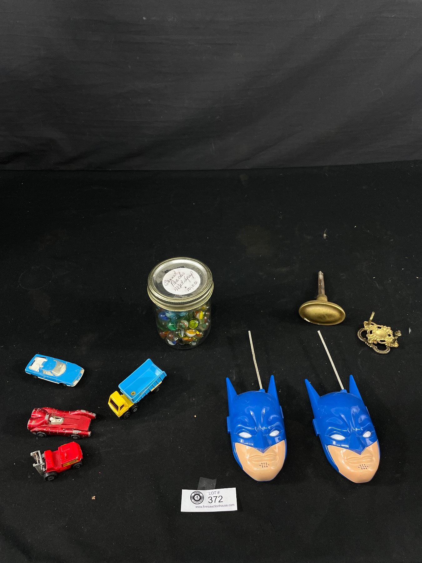 Nice Little Collectible Lot. Batman Walkie Talkies, Jar of Marbles, Some Small Cars Etc