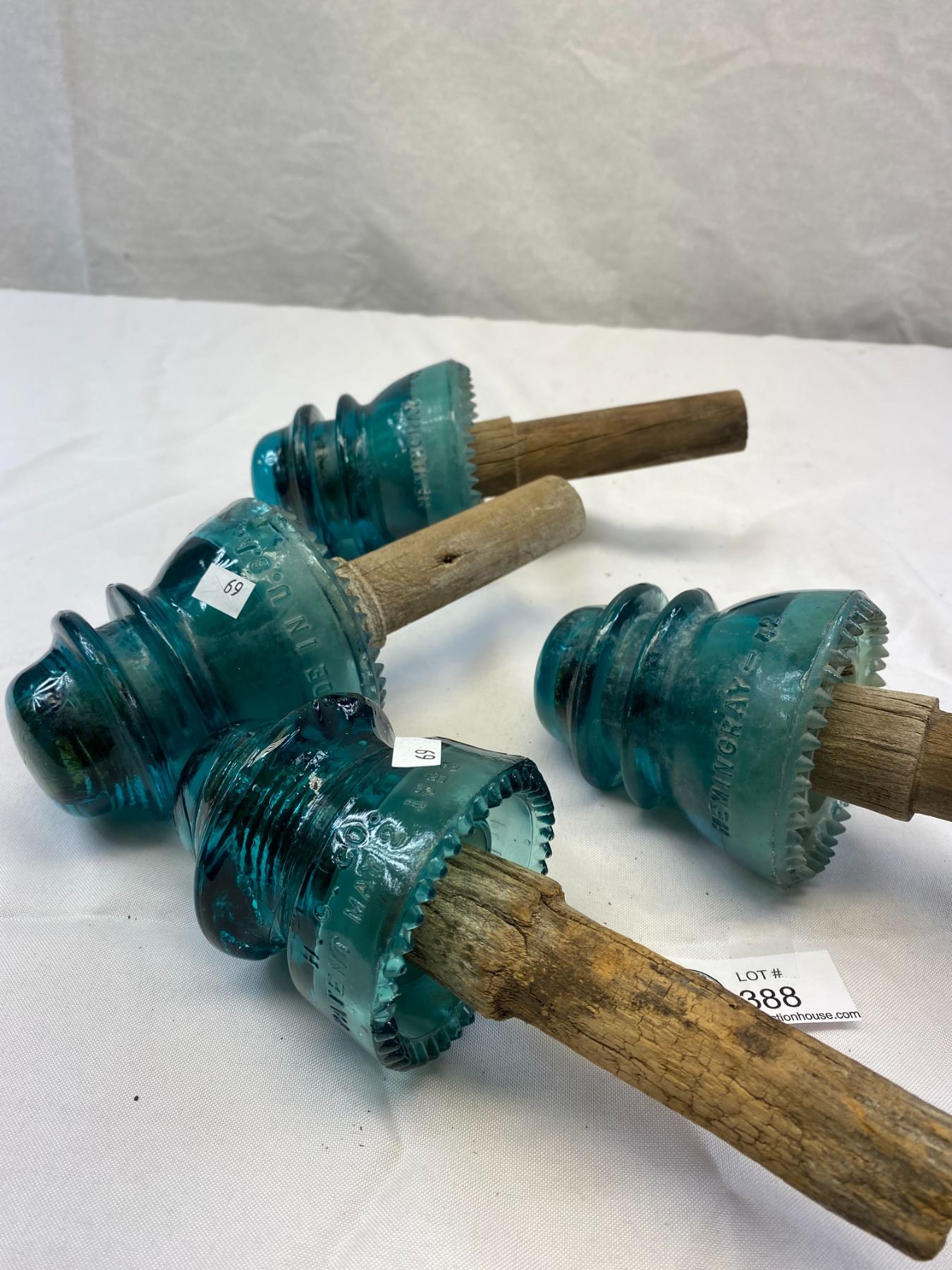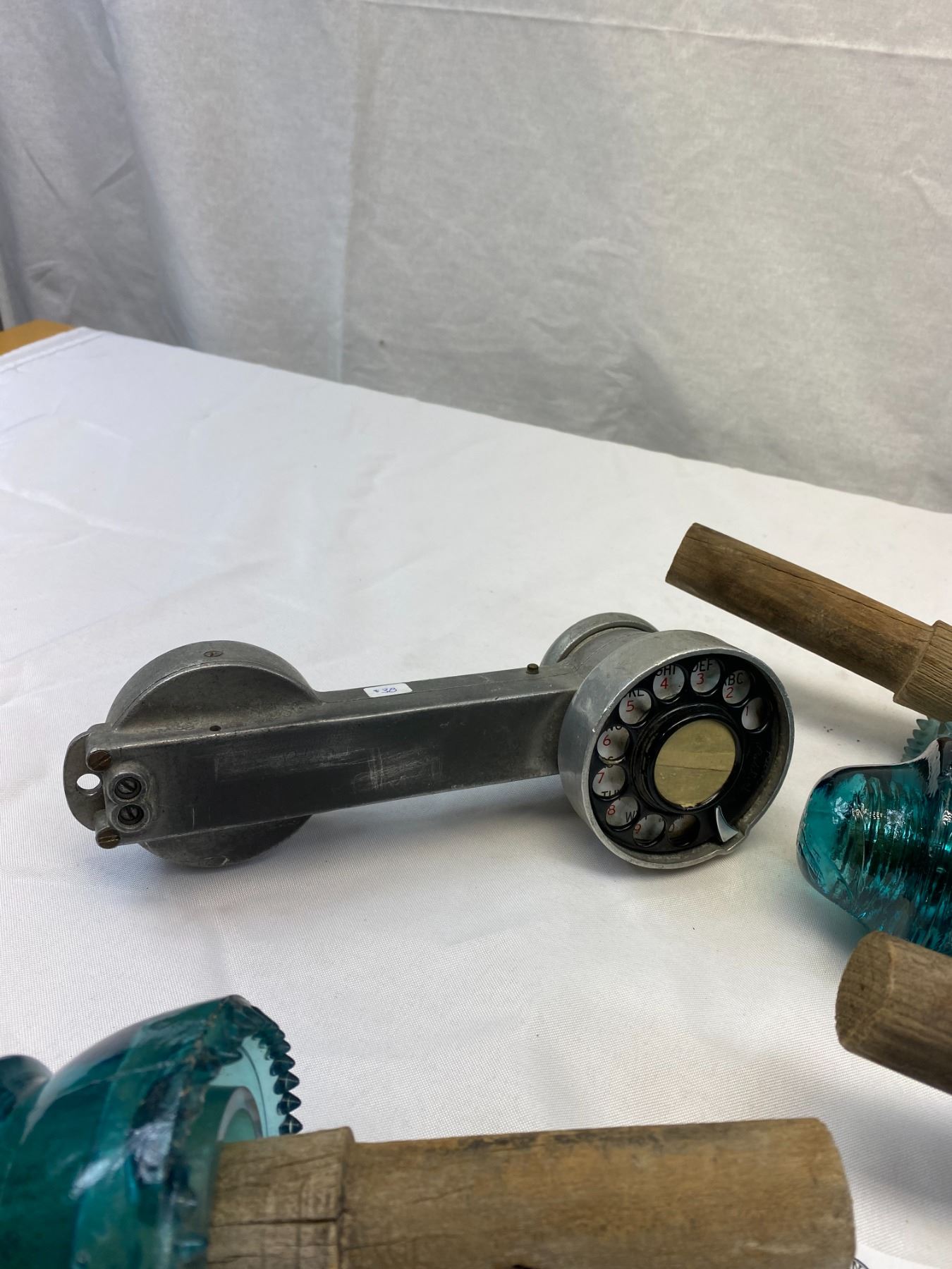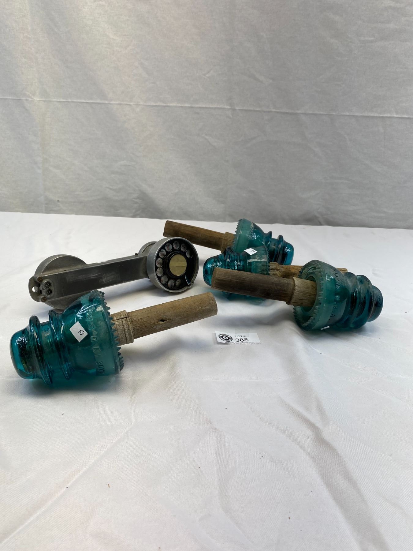 Nice Lot Of 4 Insulators On Wood Plus Telephone Repairman Phone