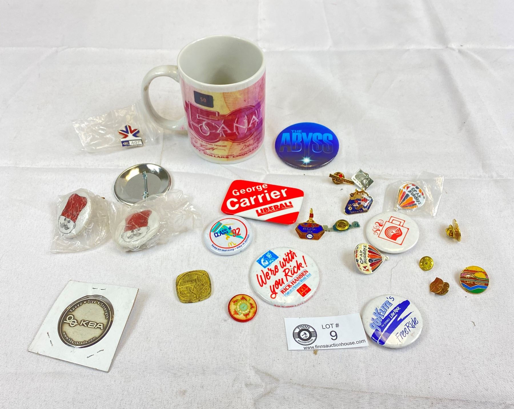Nice Lot Of Collector Pins In A $50 Bank Note Coffee Mug
