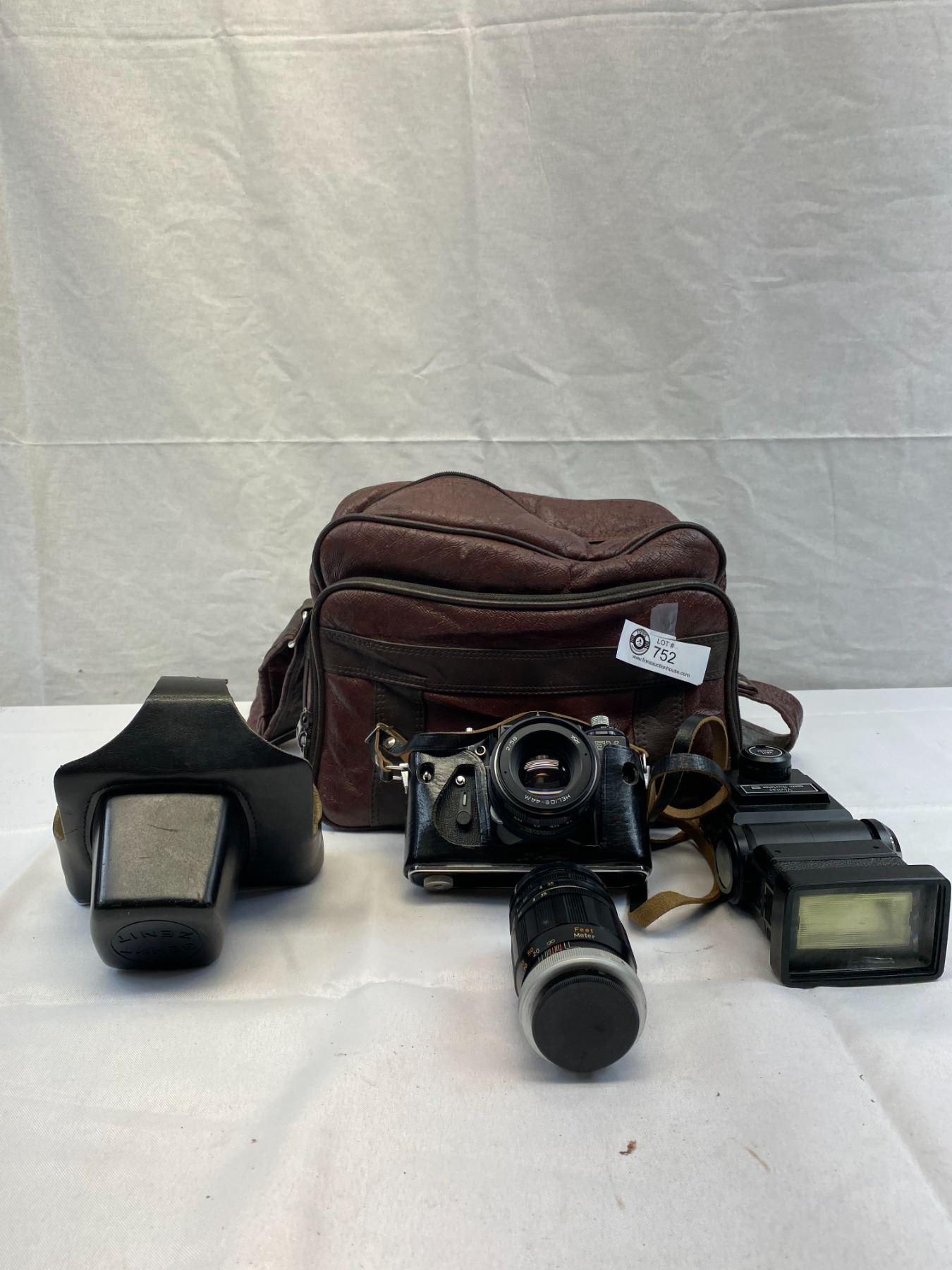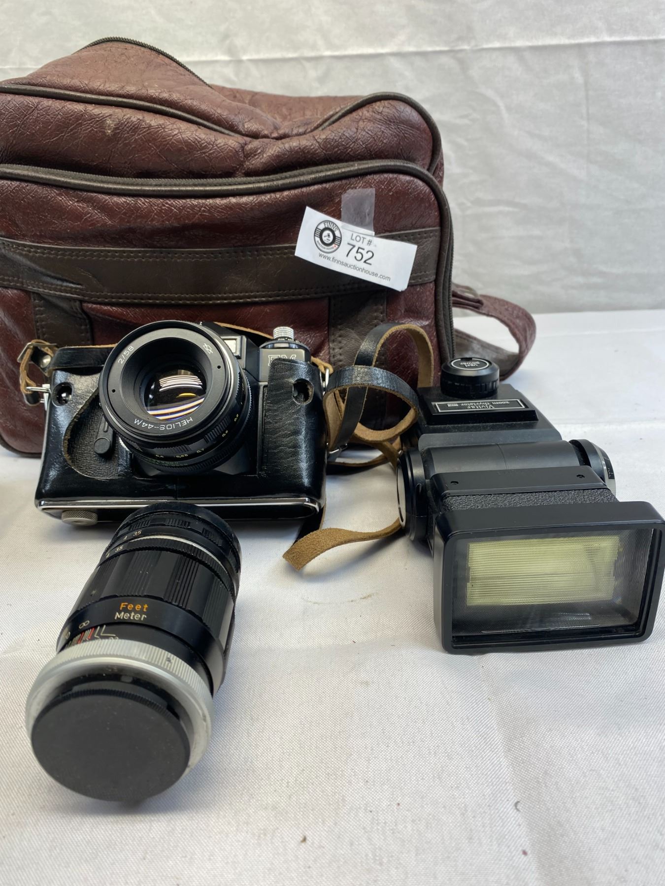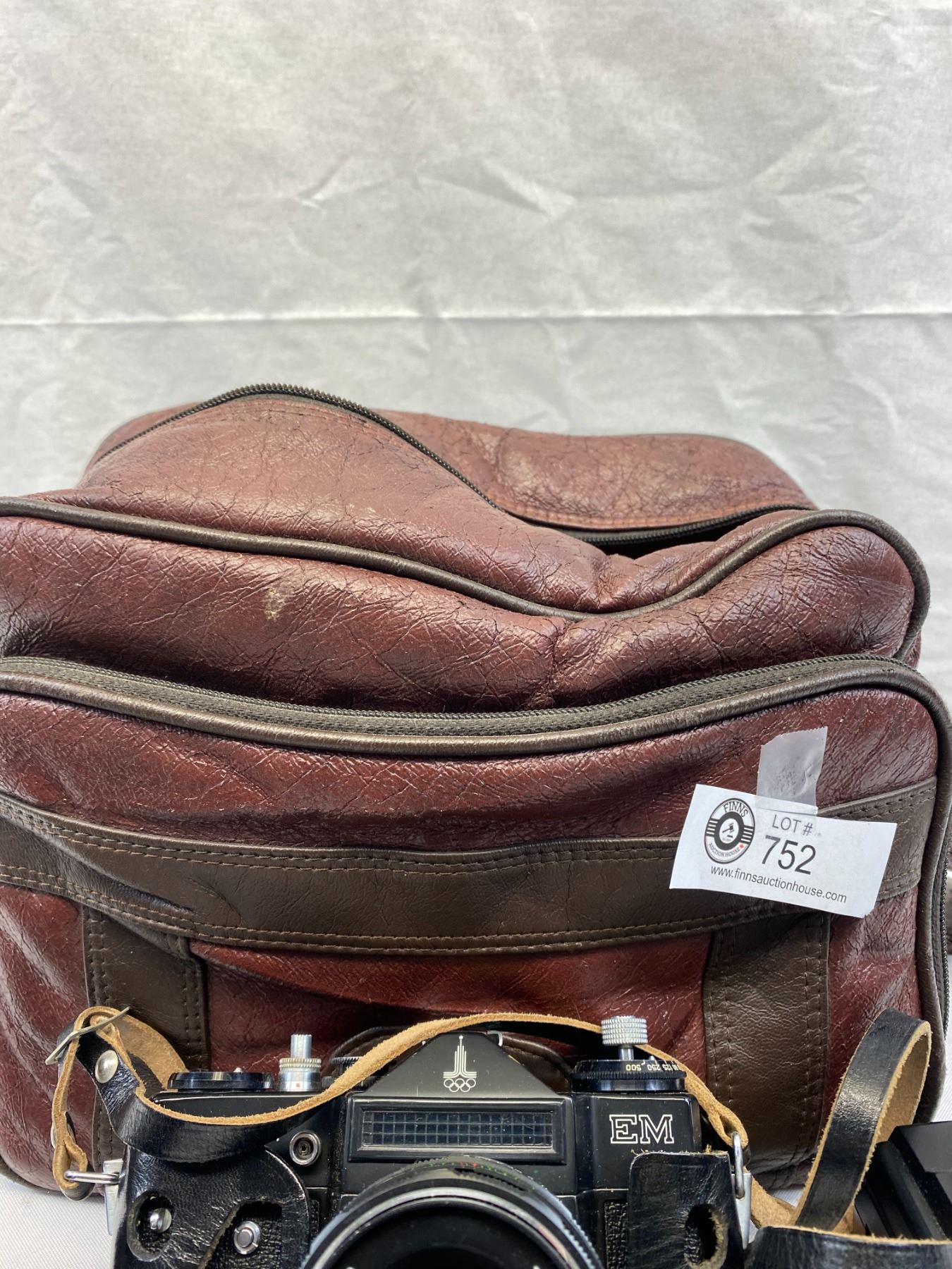 Nice Vintage Camera With Flash And Lens In Camera Bag, Zenit EM