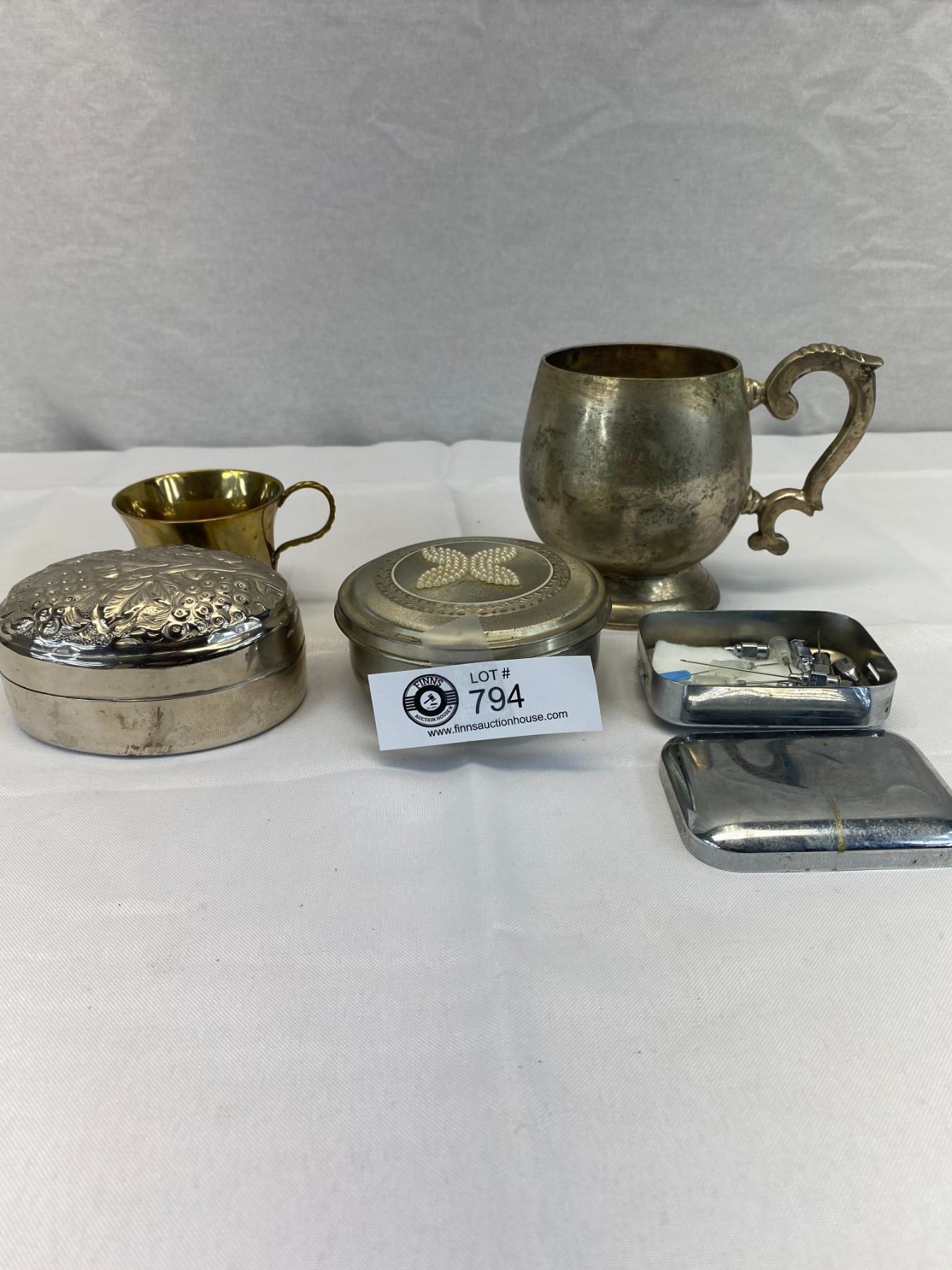 Nice Vintage Collectible Lot, Brass Tea Cup, Puter Mug, Trinket Box Plus Medical Box With 15 Hypodermic Needles Inside