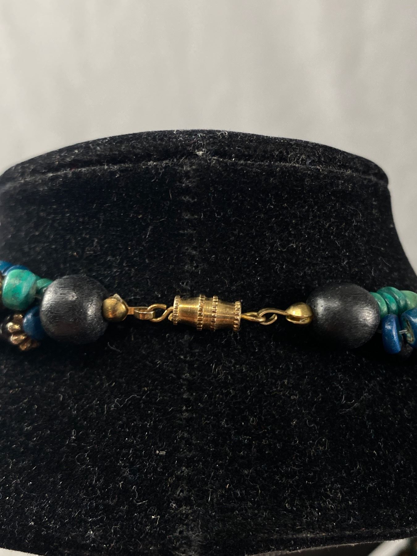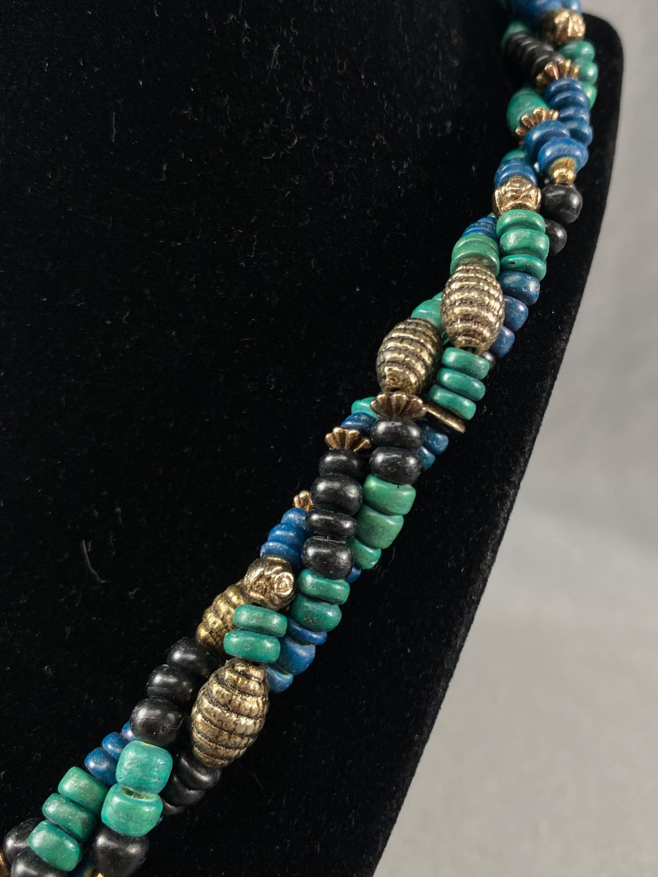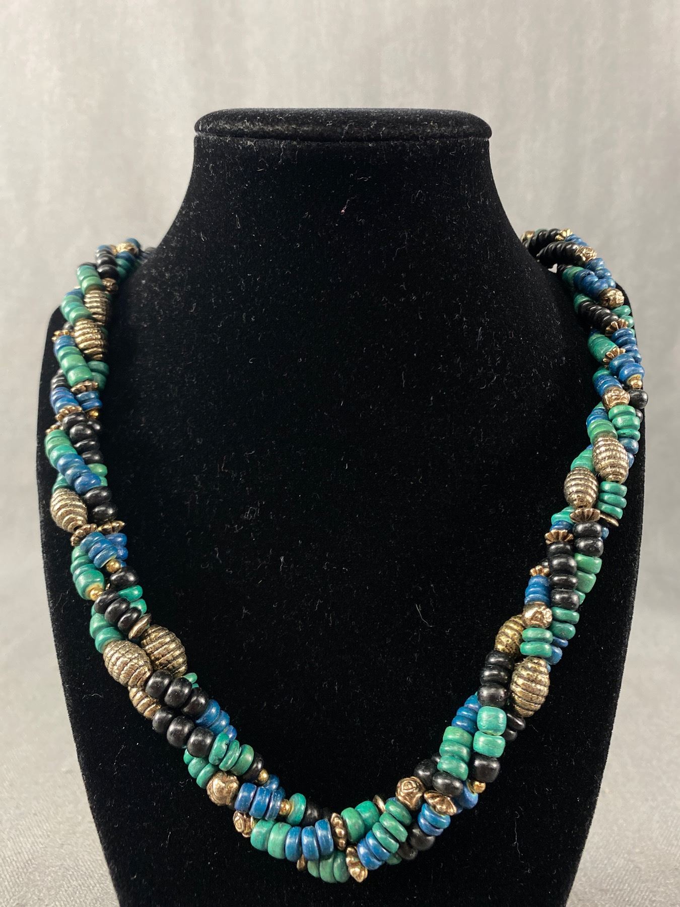 Nice Vintage Homemade Multi Strand Necklace with Green, Blue and Silvertone Beads