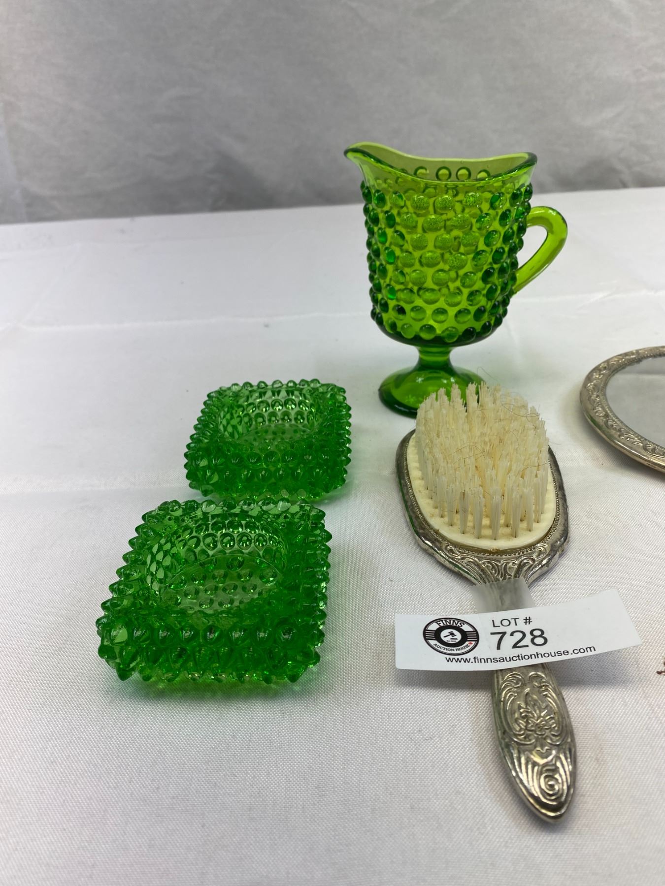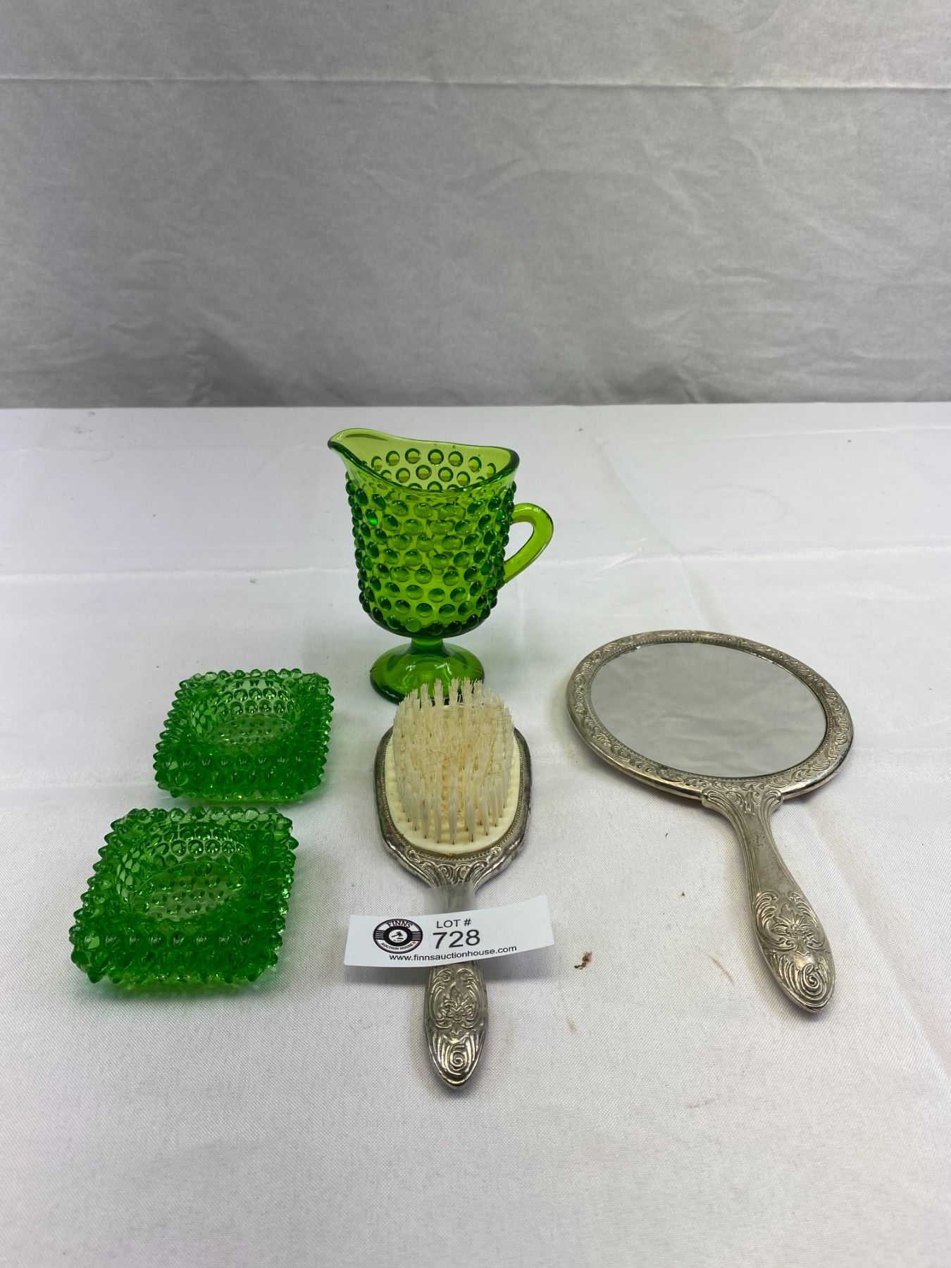 Nice Vintage Lot Of Green Glass Plus Silver Plated Brush And Mirror Set