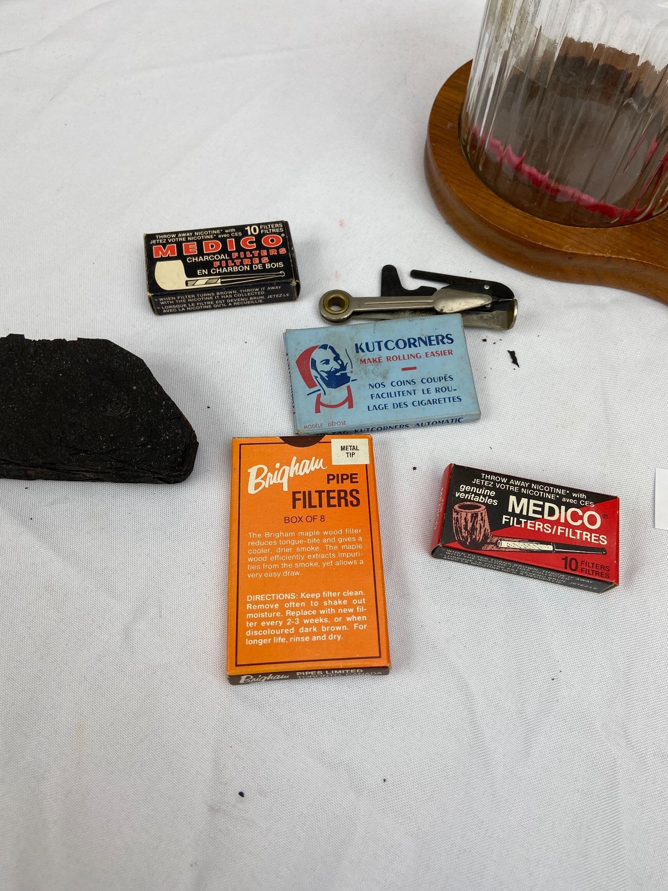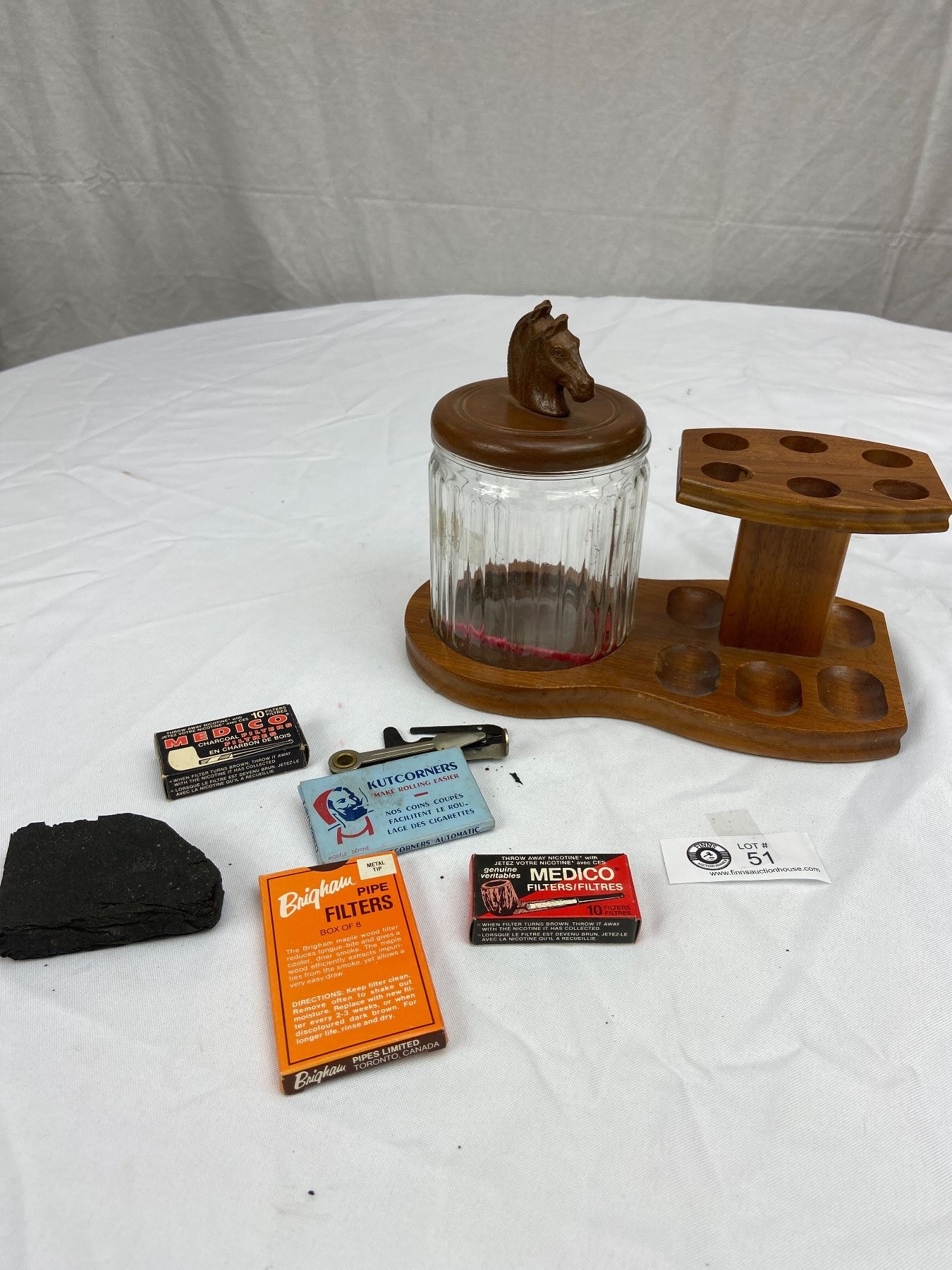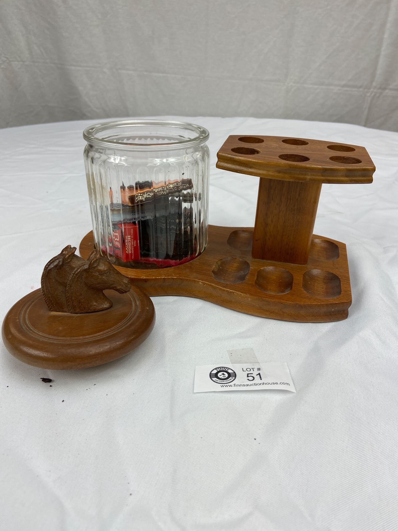 Nice Vintage Wooden Pipe Holder Lot. With Horse's Head Lid and Jar full of Pipe Cleaners, etc