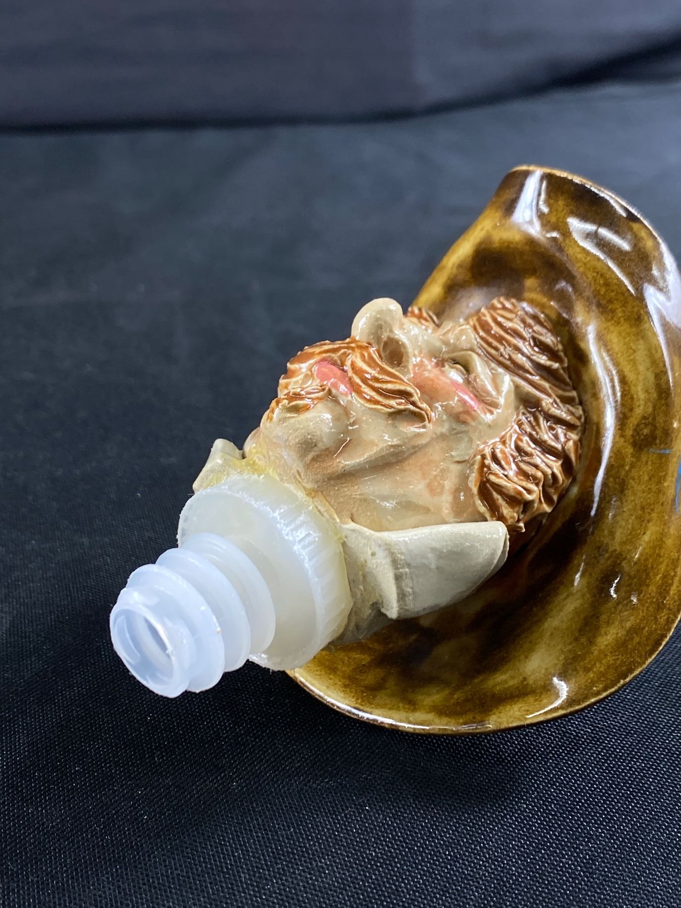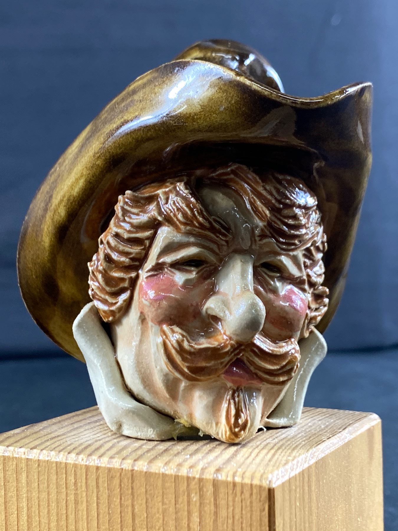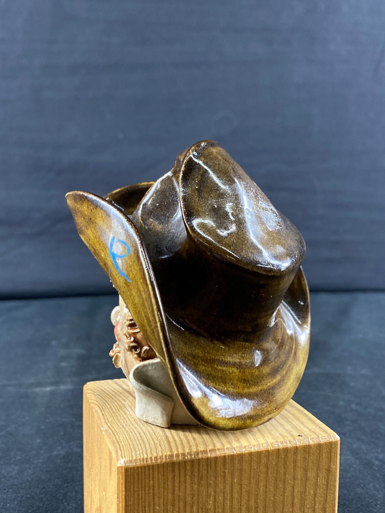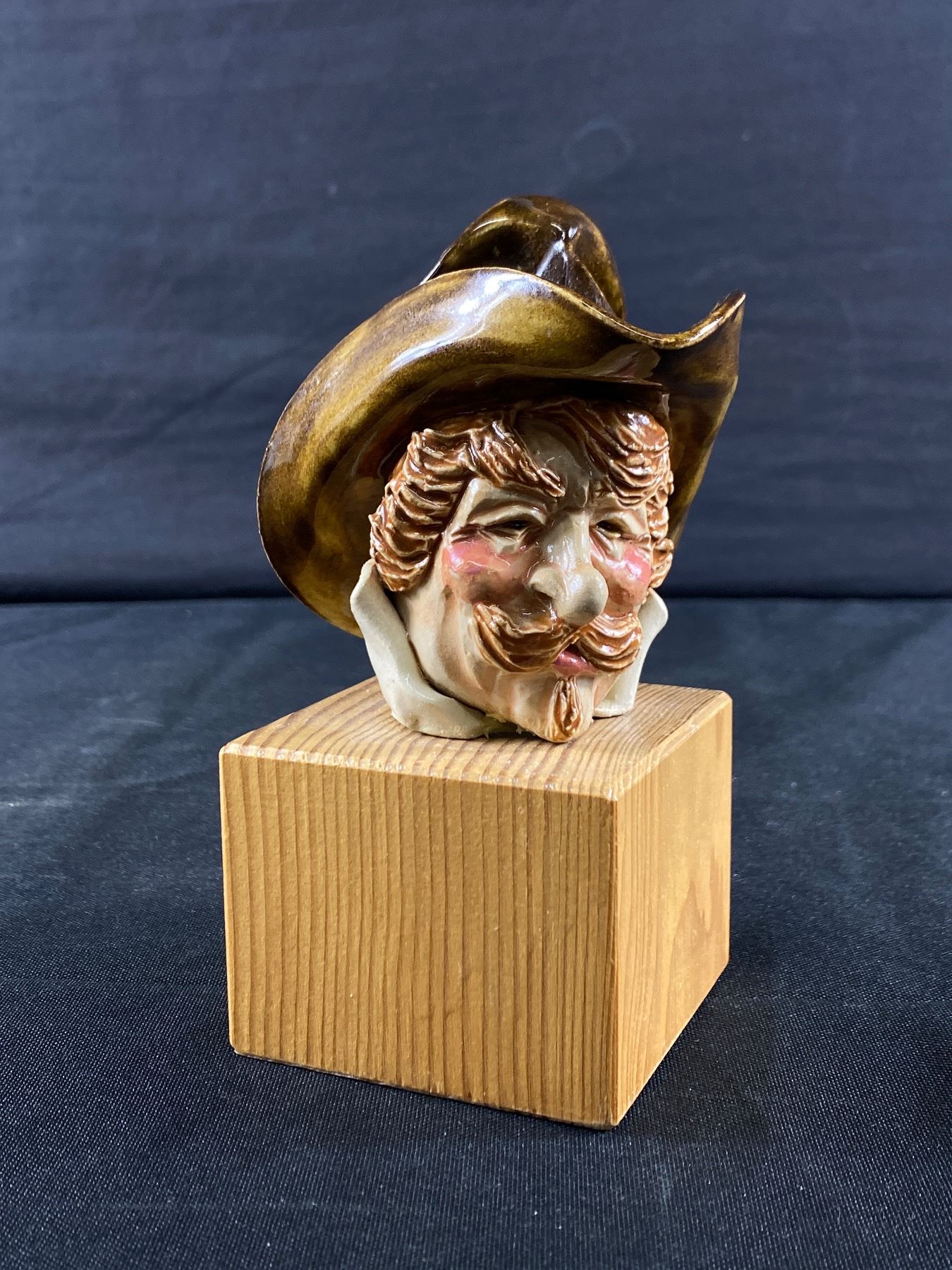 Nicely Detailed Cowboy Bottle Stopper On Wood Block Displayer. Approx. 6" H
