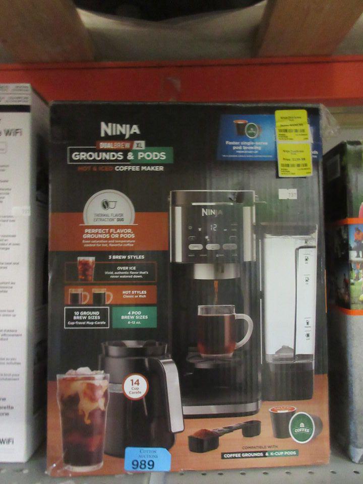 Uses grounds or pods to brew hot or cold coffee. Open box