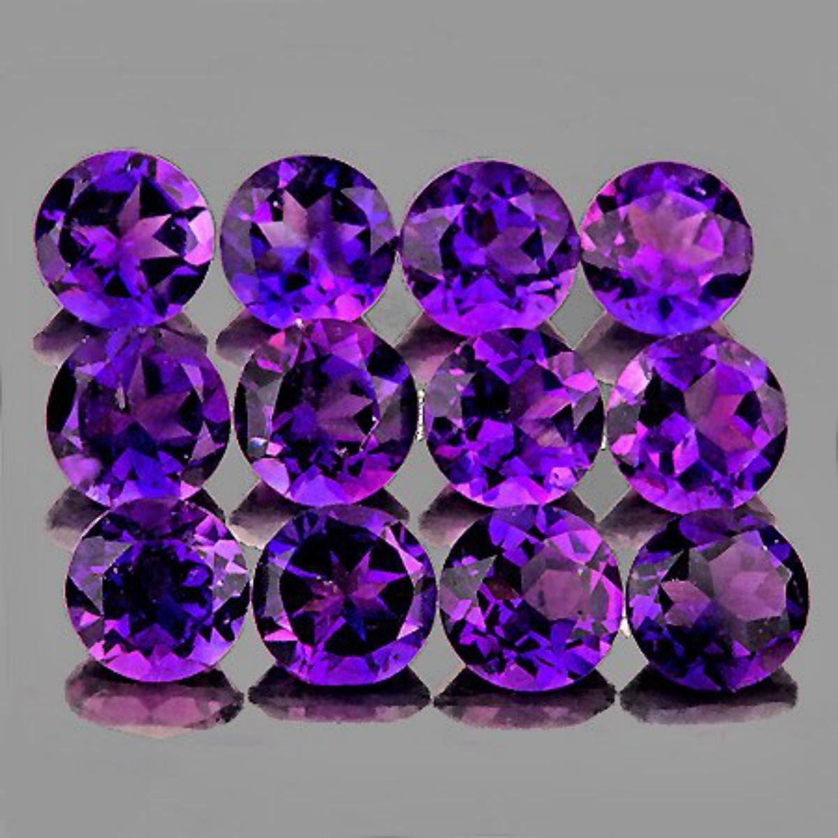 Natural Amethyst; SHAPE : Round (Diamond Cut ) SIZE ( L x W x D ) : 4.50 mm; QUANTITY : 12 pieces (Perfectly Matched Set) COLOR : Intense Purple AAA Color; CLARITY : Flawless-VVS1 AAA Grade; ORIGIN : Africa; HARDNESS : 7; LUSTER : Excellent!!! TREATMENT : 100% Natural Unheated;