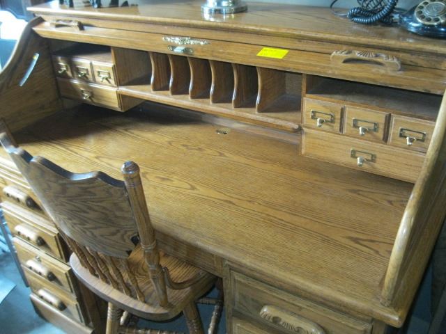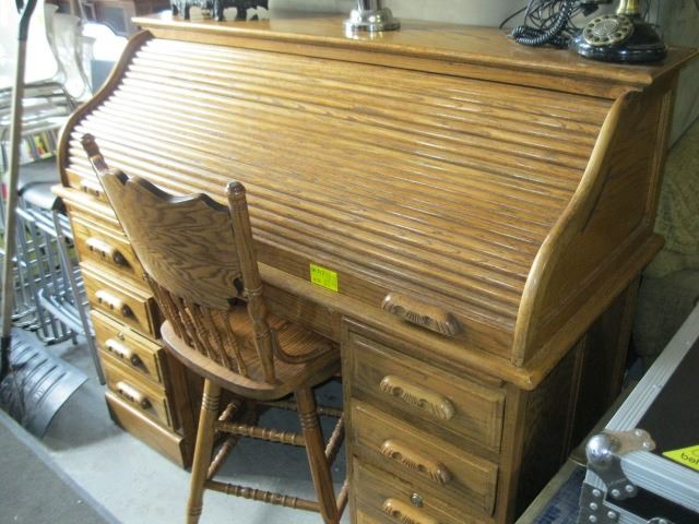 OAK DOUBLE PEDESTAL ROLLTOP DESK WITH MATCHING CHAIR