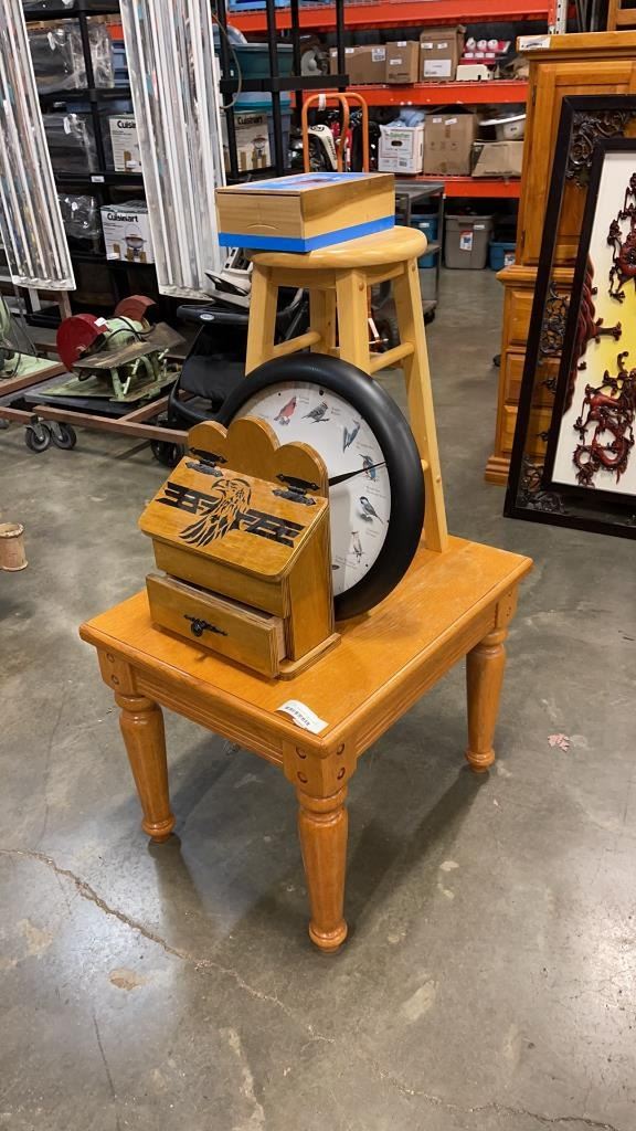OAK ENDTABLE, BAR STOOL AND 2 PAINTED JEWELLERY BOXES