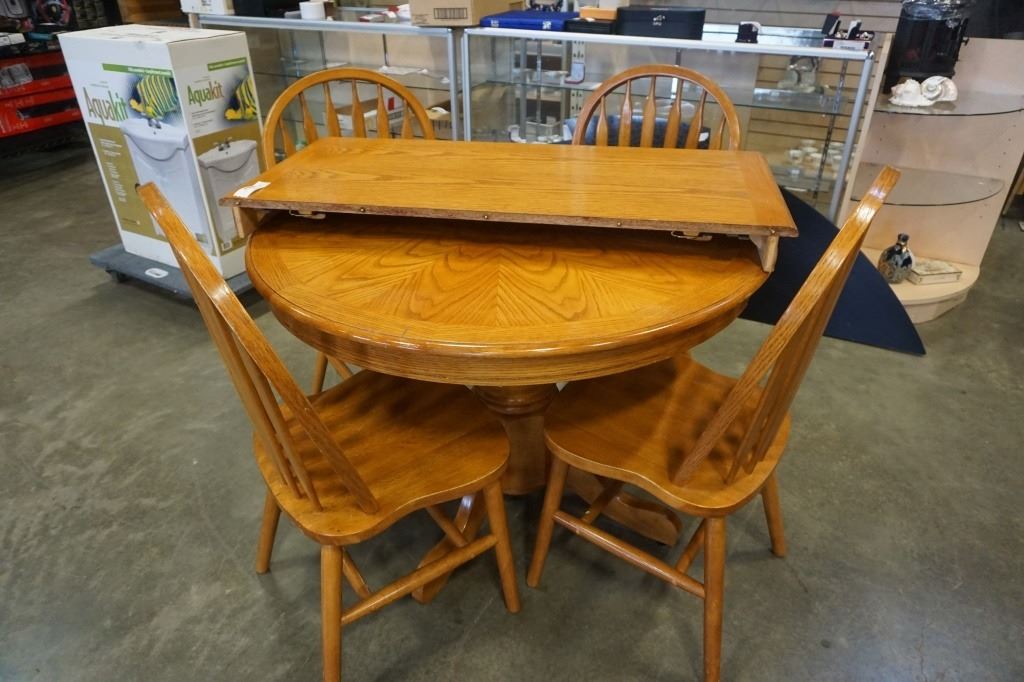 OAK DINING ROOM TABLE WITH LEAF AND 4 SPINDLE BACK CHAIRS