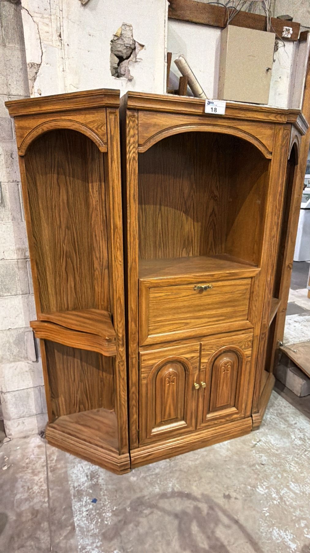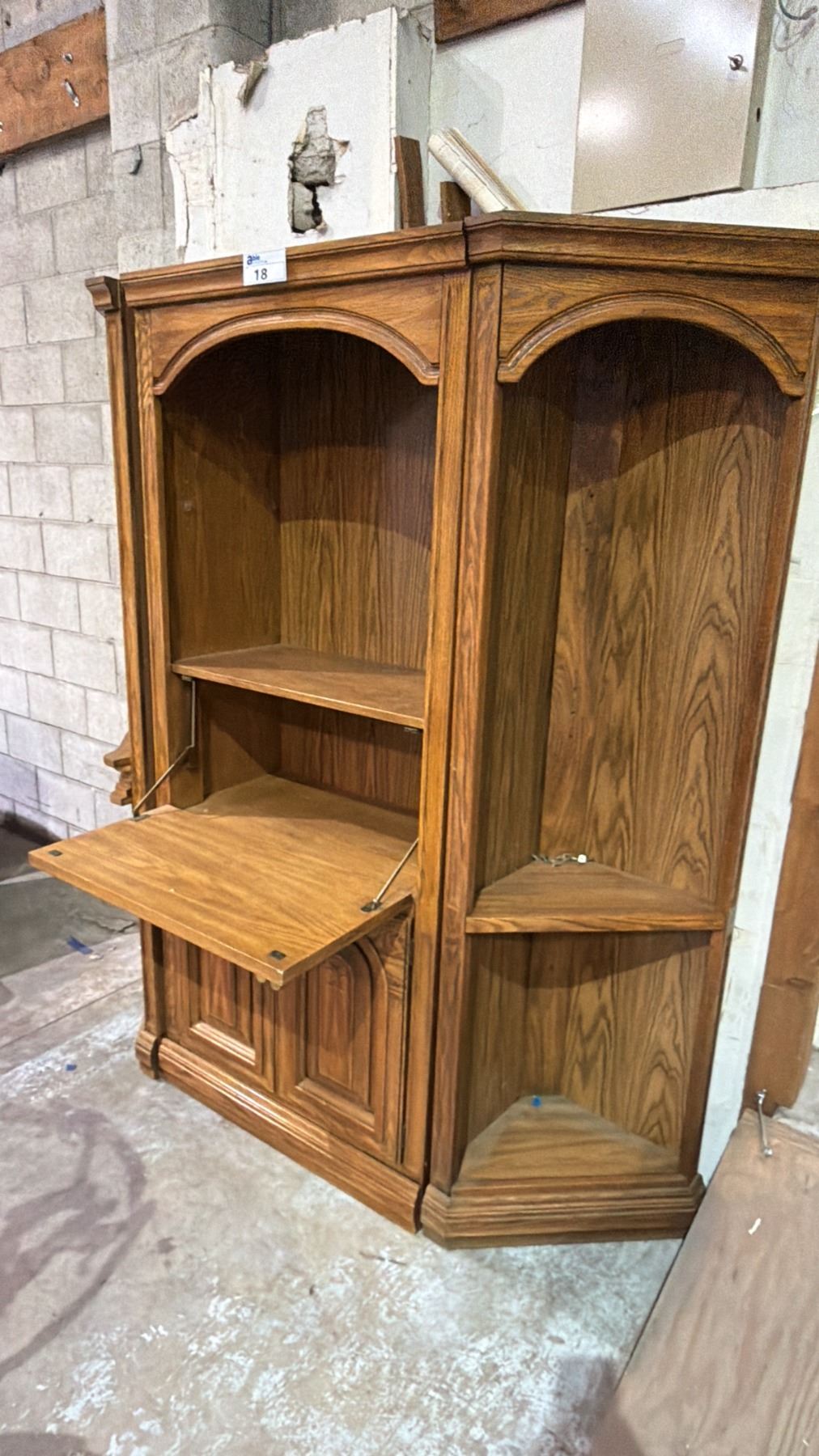 OAK STORAGE CABINET WITH TWO MATCHING CORNER SHELVES - CABINET MEASURES APPROX. 32"W X 16"D X 75"H, CORNER SHELVES MEASURE APPROX. 24"W X 12"D X 75"H