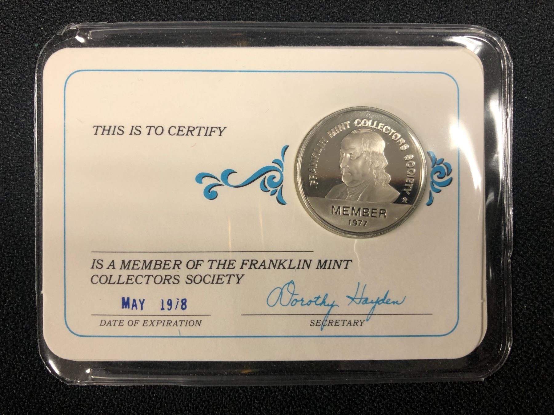 OFFICIAL MEMBERSHIP CARD OF THE FRANKLIN MINT COLLECTORS SOCIETY W/ STERLING SILVER MEDAL 1977