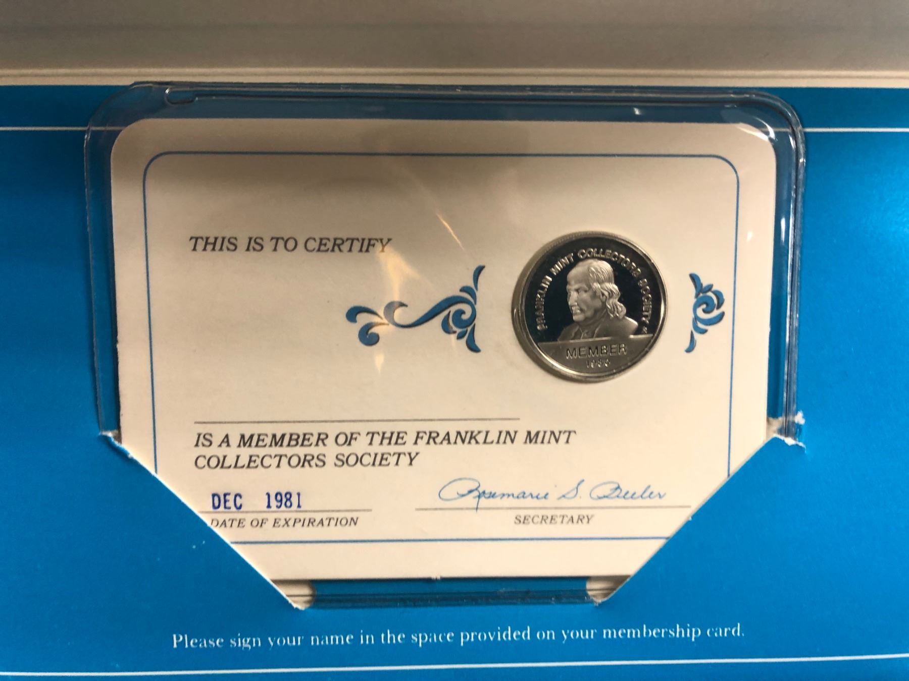 OFFICIAL MEMBERSHIP CARD OF THE FRANKLIN MINT COLLECTORS SOCIETY W/ STERLING SILVER MEDAL 1980