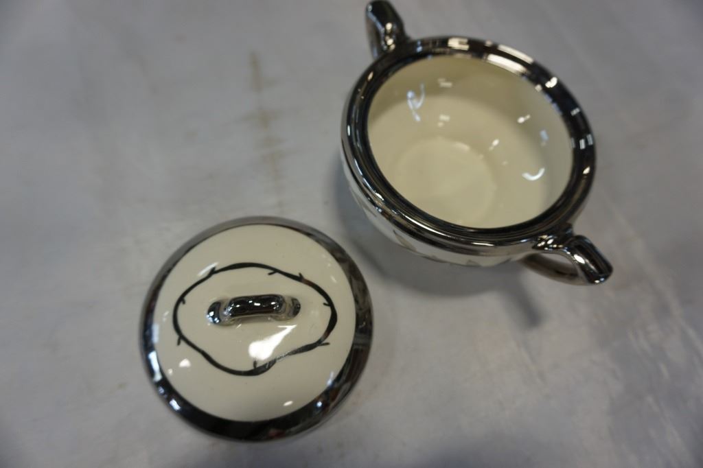 OLD SILVER LUSTRE SILVER OVERLAY HAND PAINTED CHINA TEAPOT, CRAM AND SUGAR AND PLATTER