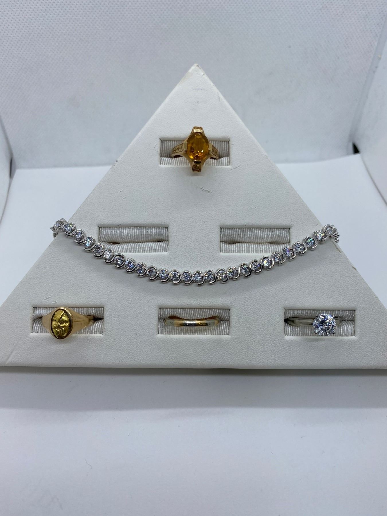 ONE LADIES VINTAGE 14KT YELLOW GOLD AND 18KT WHITE GOLD WEDDING RING REPLACEMENT VALUE $375.00 ONE LADIES 14KT YELLOW GOLD AND NATURAL PLACER GOLD NUGGET DRESS RING REPLACEMENT VALUE: $ 700.00 ONE LADIES 14KT WHITE GOLD COLOURLESS CUBIC ZIRCONIUM DRESS RING, REPL VALUE $500.00, ONE STERLING SILVER COLOURLESS CUBIC ZIRCONIA TENNIS STYLE BRACELET, REPL VALUE $200.00, ONE LADIES VINTAGE 14KT YELLOW GOLD YELLOW STONE DRESS RING RPL VLUE $425.00