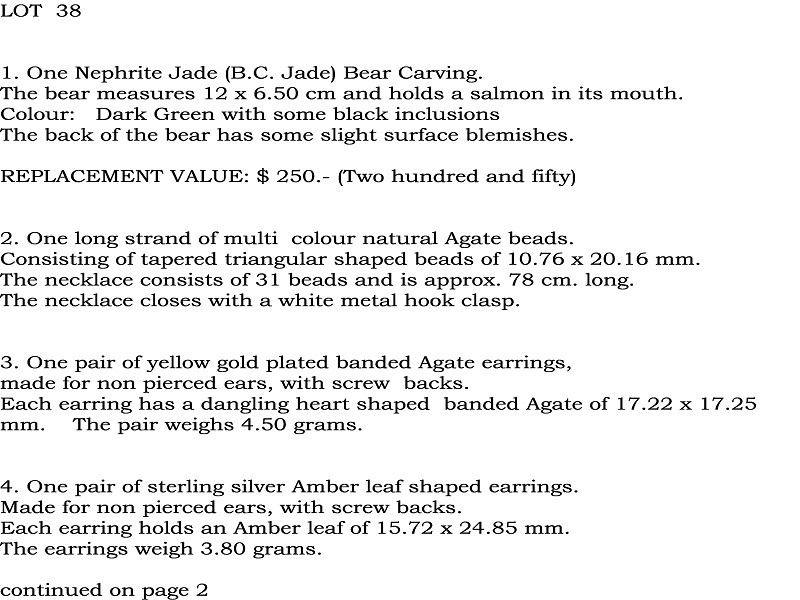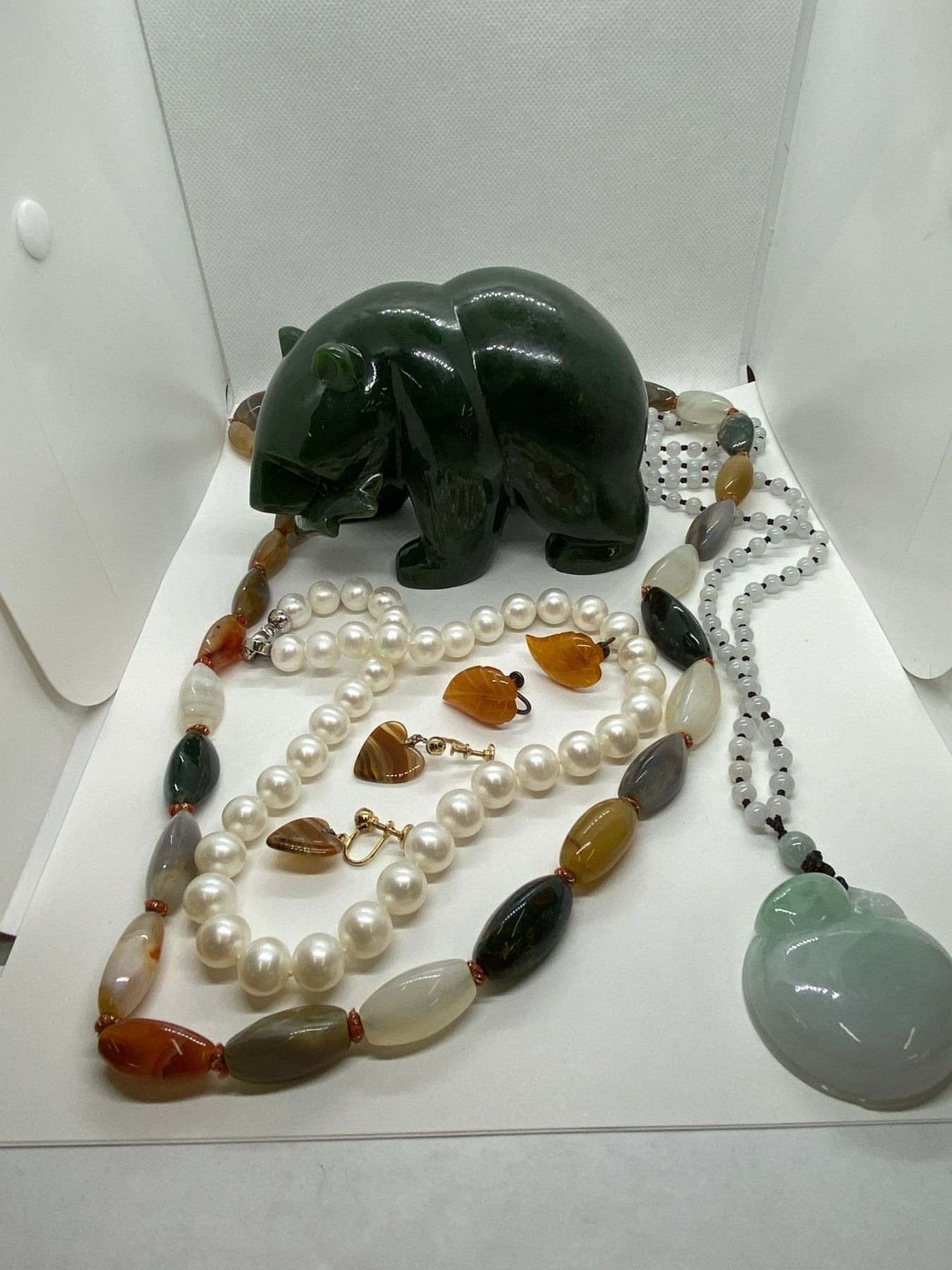 ONE NEPHRITE JADE (B.C. JADE) BEAR CARVING, REPLACEMENT VALUE: $ 250.00, ONE LONG STRAND OF MULTI COLOUR NATURAL AGATE BEADS ONE PAIR OF YELLOW GOLD PLATED BANDED AGATE EARRINGS,ONE PAIR OF STERLING SILVER AMBER LEAF SHAPED EARRINGS ONE STRAND OF NEAR SPHERICAL WHITE FRESH WATER CULTURED PEARLS, REPL VAL $450.00, ONE ROUND SHAPED NATURAL BURMESE JADEITE REPLACEMENT VALUE: $ 575.00,