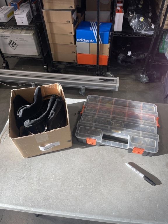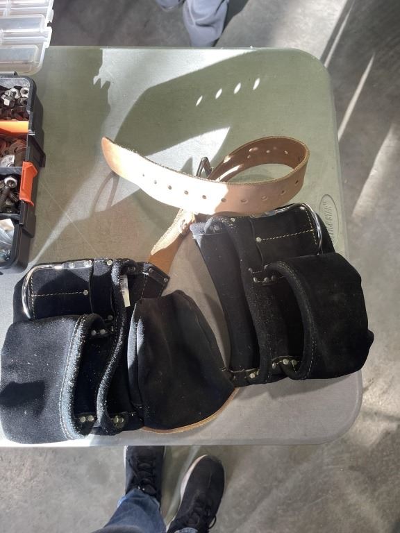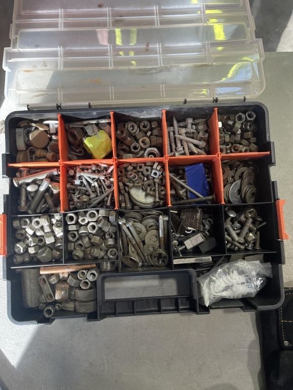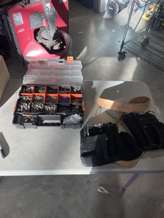 ORAGNIZER WITH ASSORTED HARDWARE AND LEATHER TOOL BELT