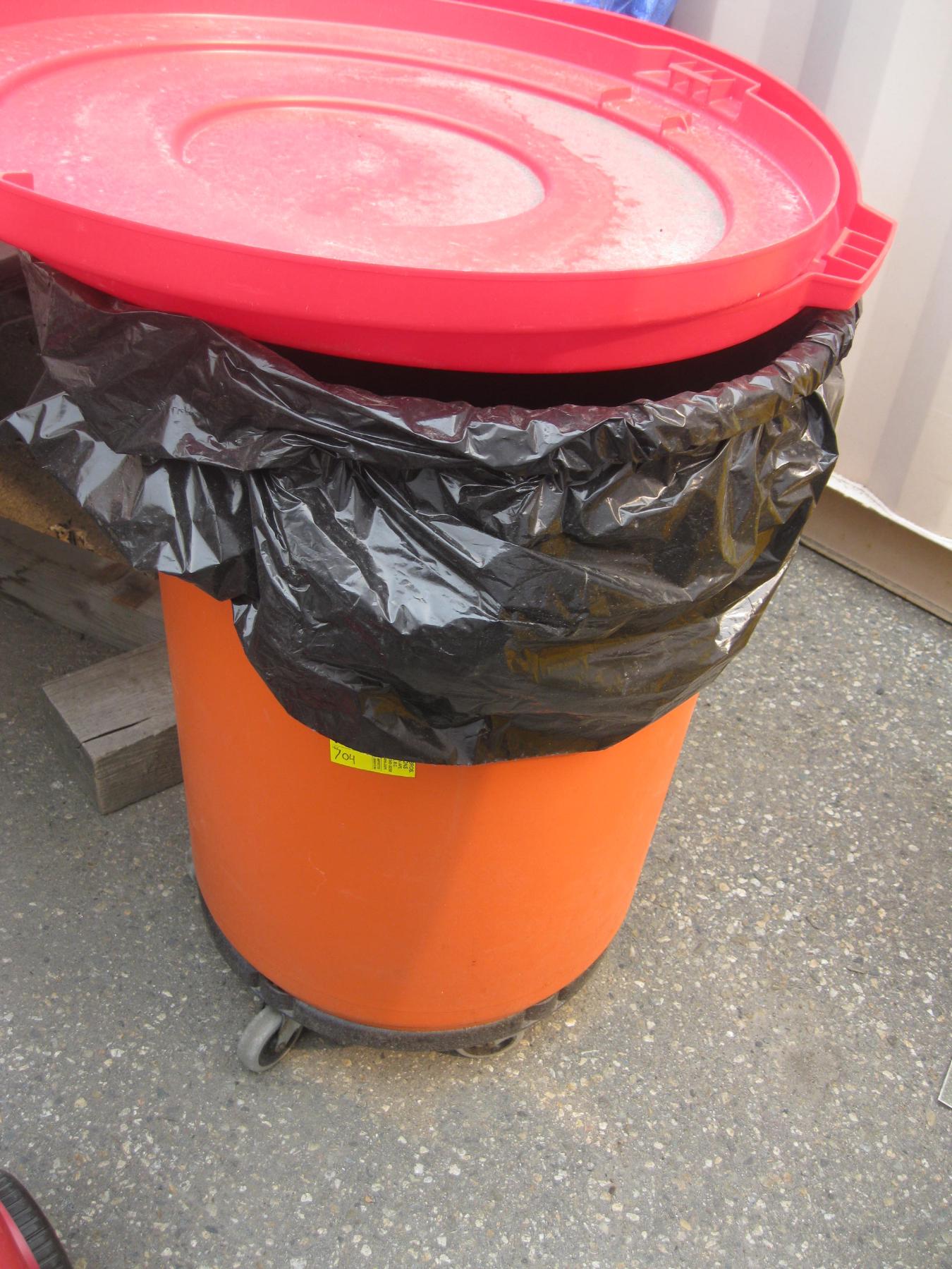 ORANGE GARBAGE CAN ON ROLLING STAND W/LID