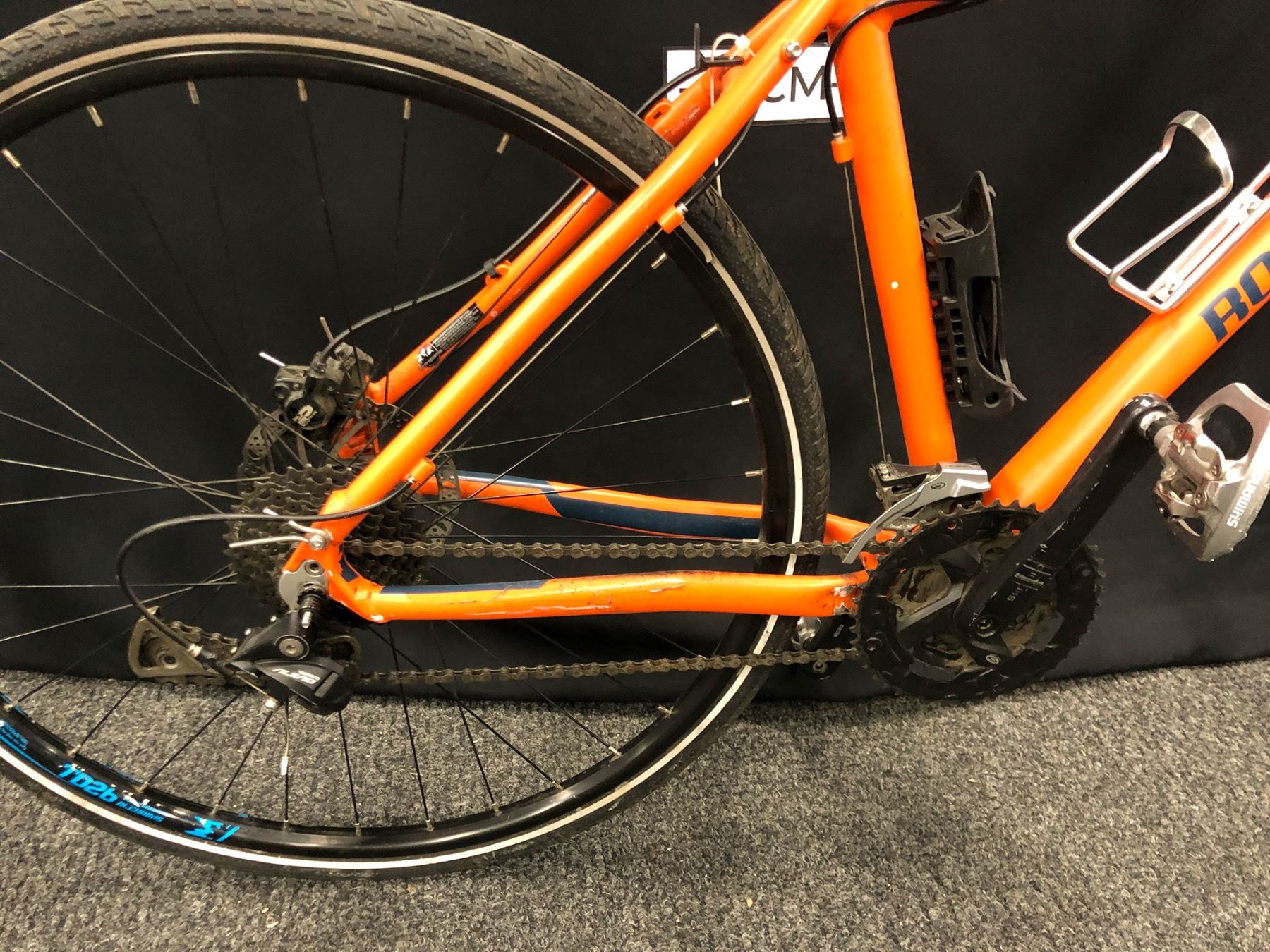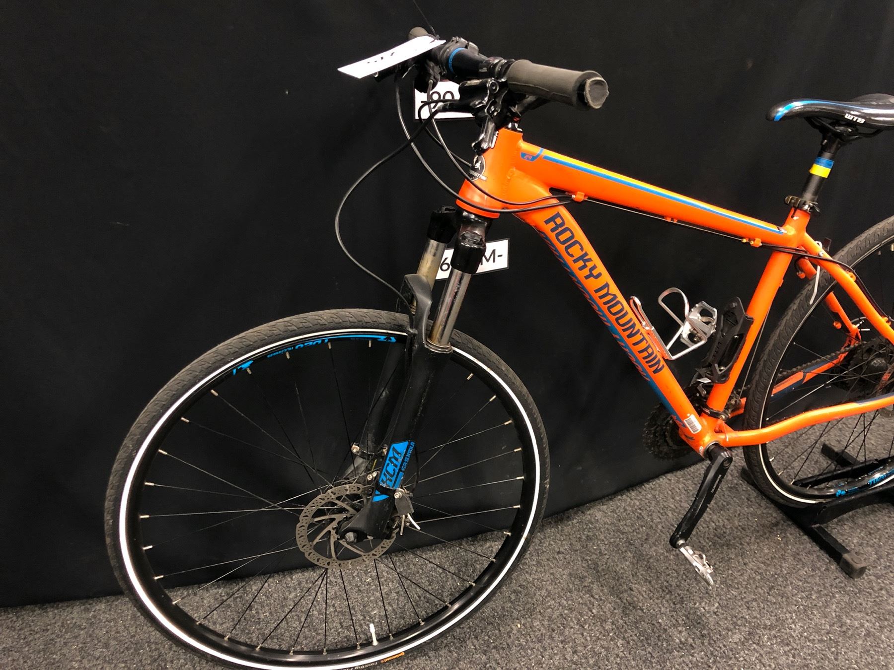 ORANGE ROCKY MOUNTAIN SOUL 27 SPEED FRONT SUSPENSION TRAIL BIKE WITH FRONT AND REAR HYDRAULIC DISC BRAKES AND HYBRID CLIP PEDALS, LARGE FRAME SIZE