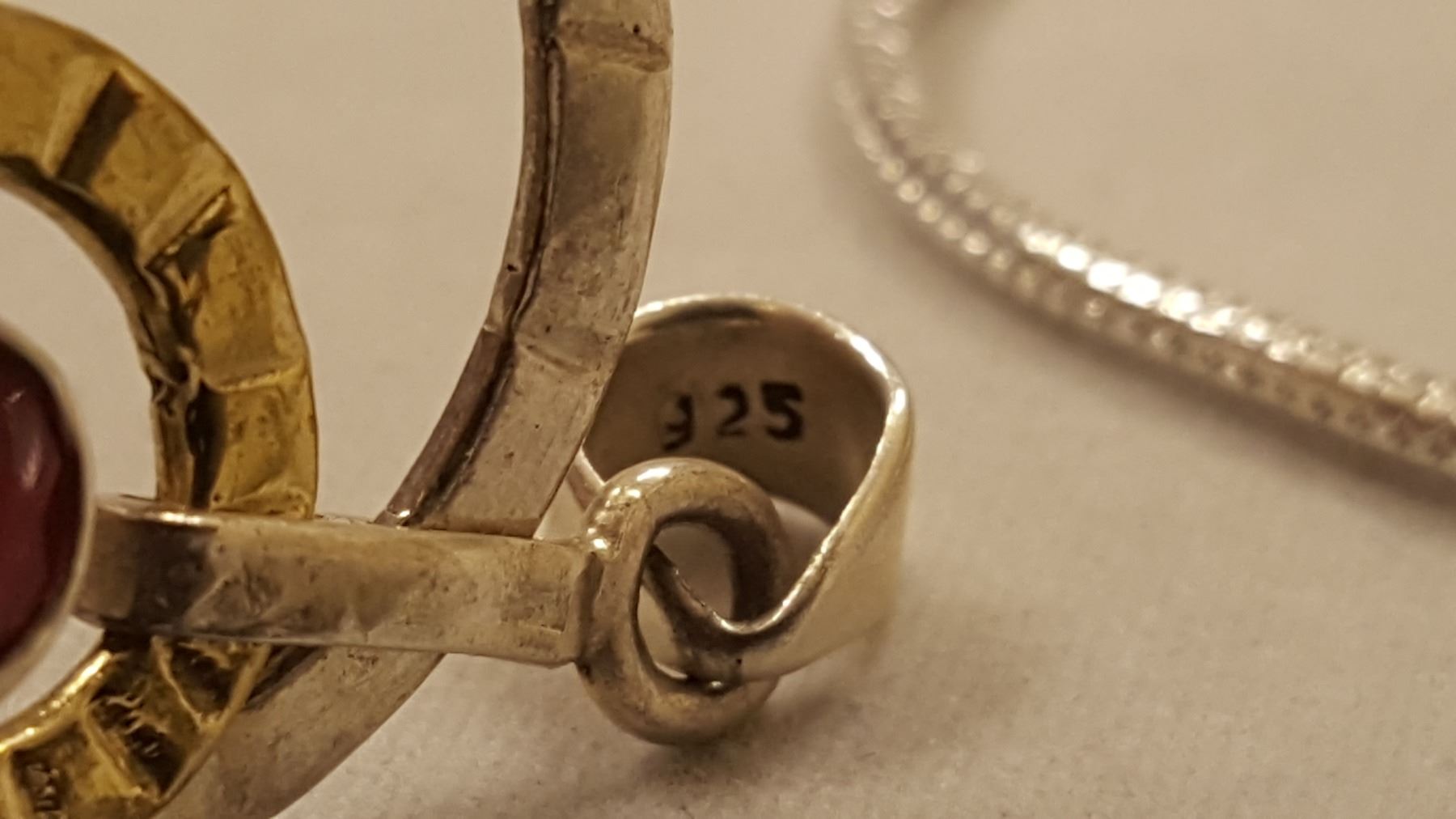 OUTSTANDING 1 CT RUBY PENDANT. MOUNTED IN ELABORATLY DESIGNED .925 STERLING SILVER. PARTIALLY ACCENTED WITH A 14 kt GOLD OVERLAY. INCLUDES 20 " LONG 2 MM CHAIN 61.50 CTTW. EYE CATCHING AND VERY UNIQUE.
