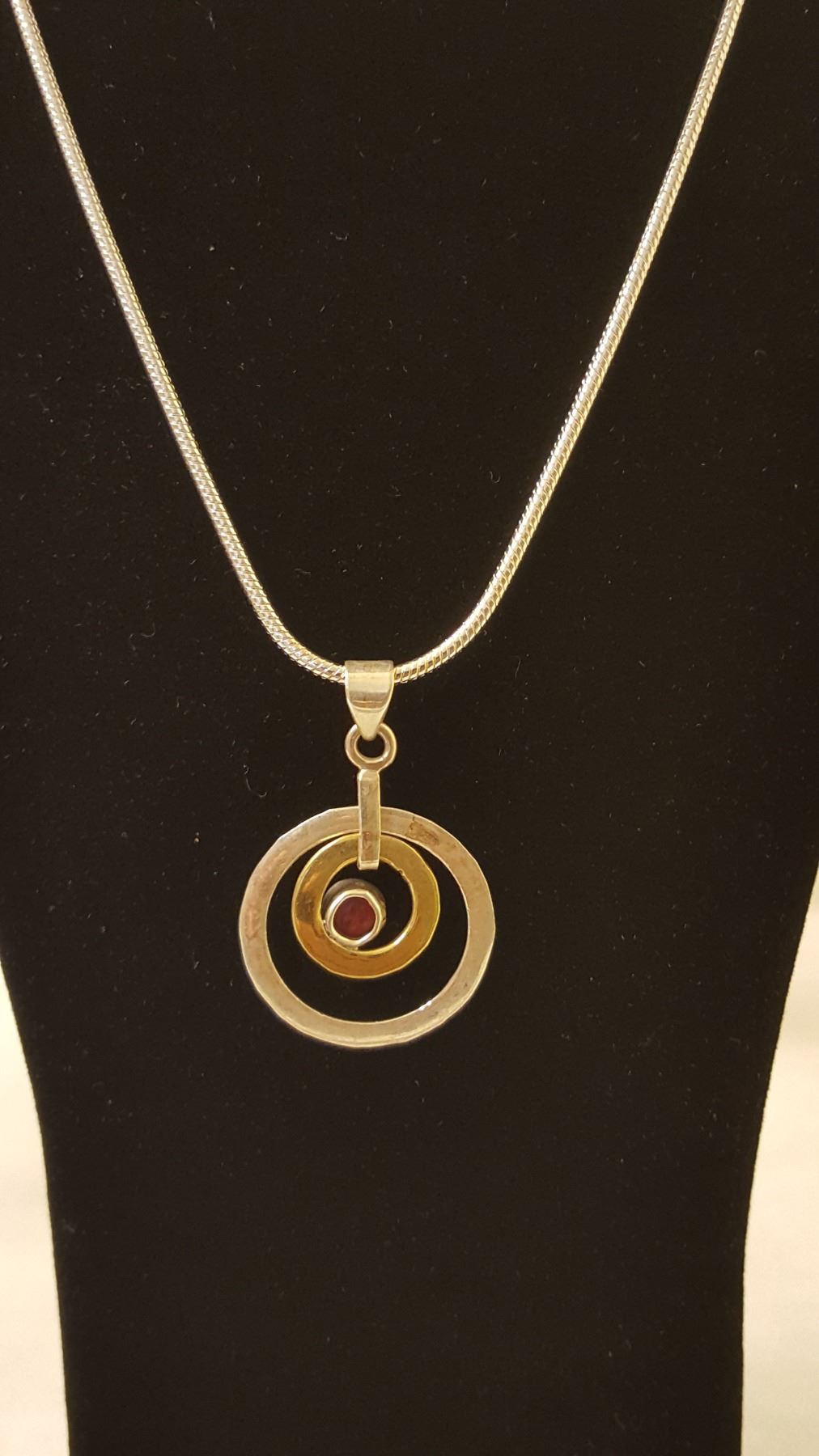 OUTSTANDING 1 CT RUBY PENDANT. MOUNTED IN ELABORATLY DESIGNED .925 STERLING SILVER. PARTIALLY ACCENTED WITH A 14 kt GOLD OVERLAY. INCLUDES 20 " LONG 2 MM CHAIN 61.50 CTTW. EYE CATCHING AND VERY UNIQUE.