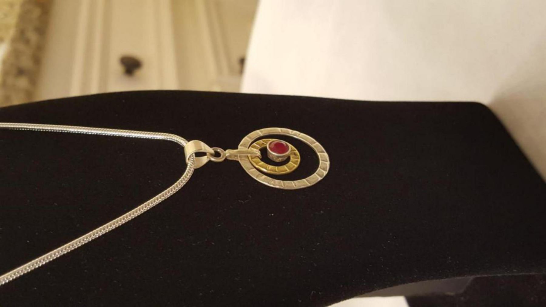 OUTSTANDING 1 CT RUBY PENDANT. MOUNTED IN ELABORATLY DESIGNED .925 STERLING SILVER. PARTIALLY ACCENTED WITH A 14 kt GOLD OVERLAY. INCLUDES 20 " LONG 2 MM CHAIN 61.50 CTTW. EYE CATCHING AND VERY UNIQUE.