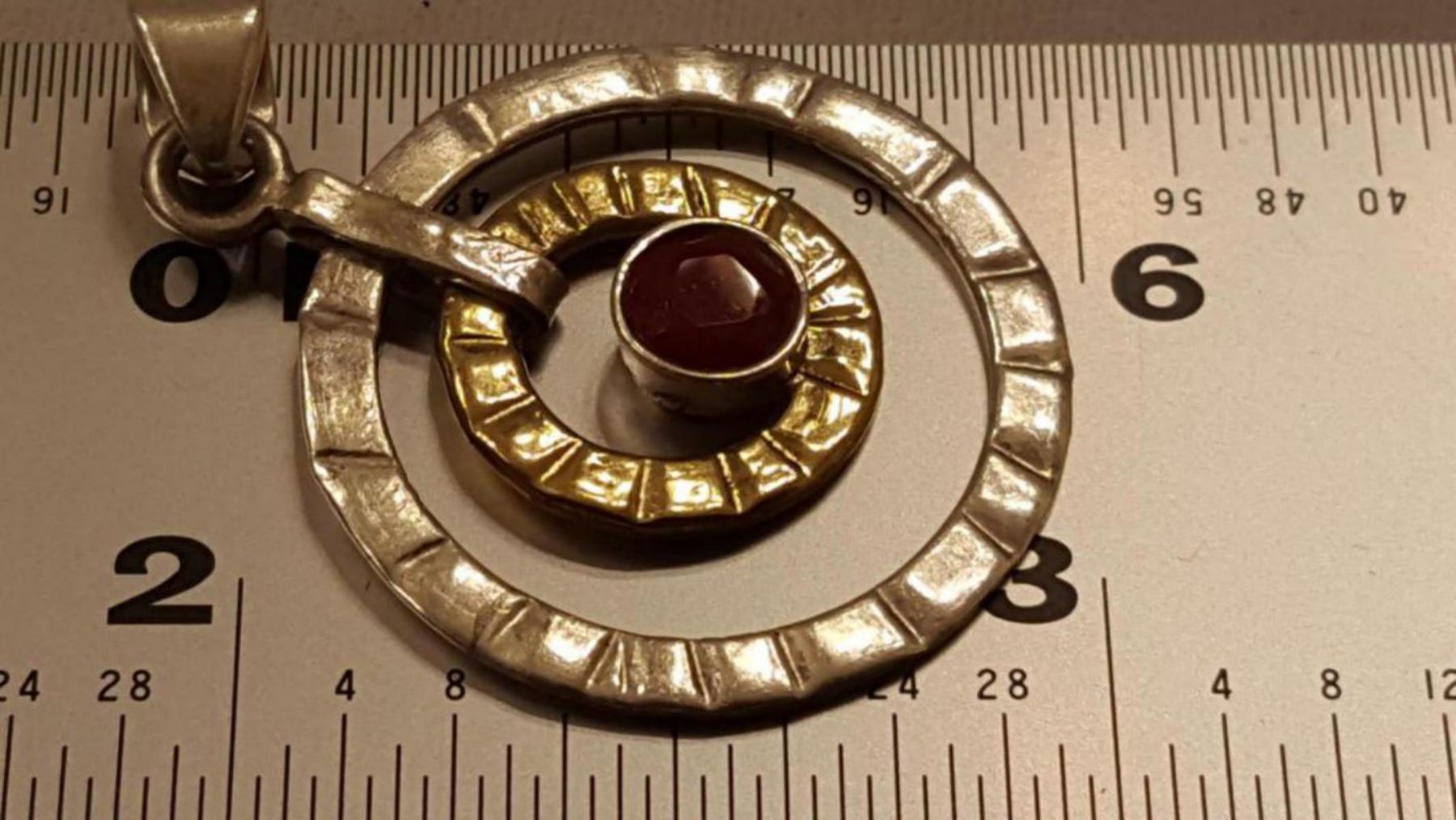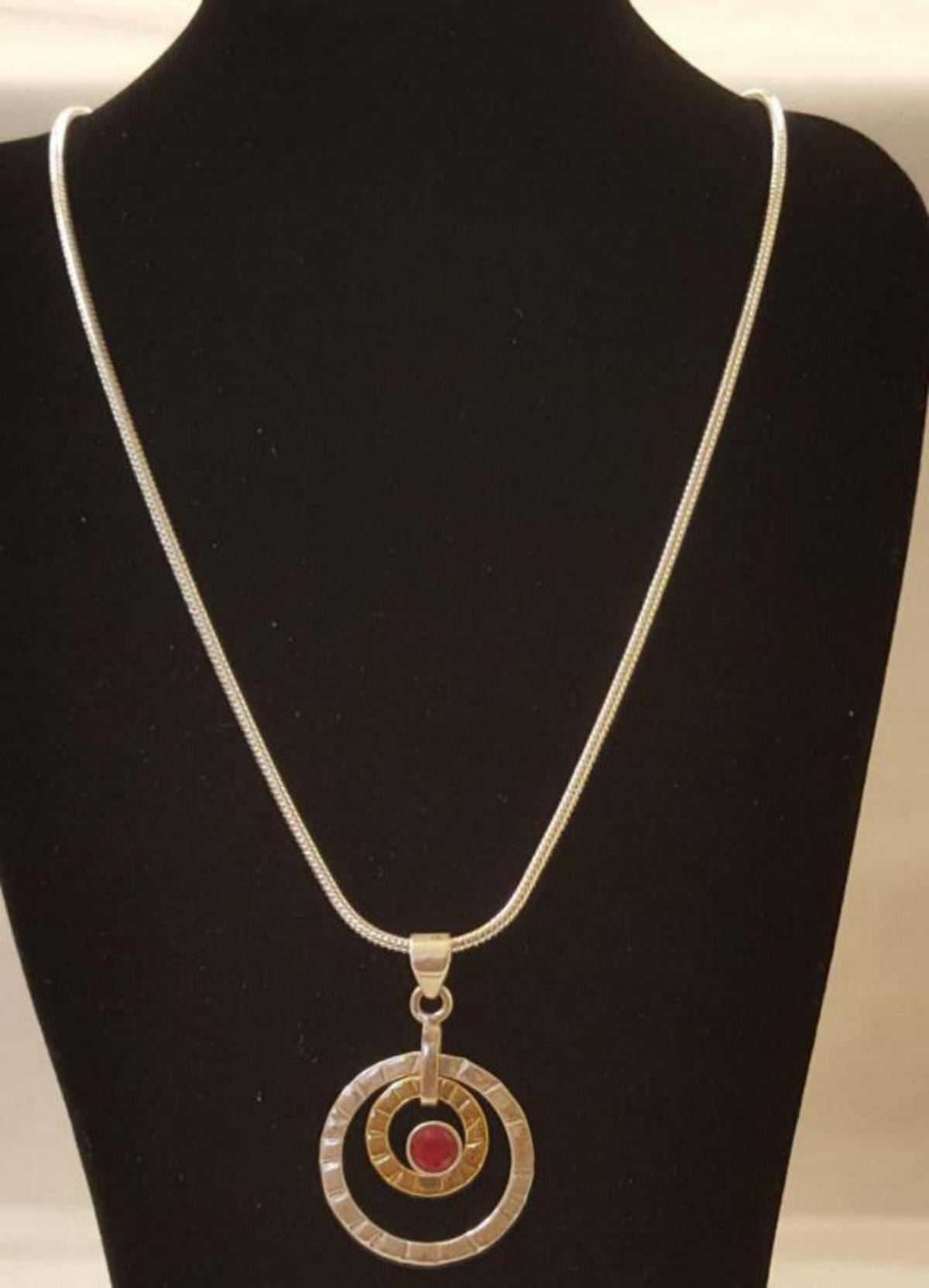 OUTSTANDING 1 CT RUBY PENDANT. MOUNTED IN ELABORATLY DESIGNED .925 STERLING SILVER. PARTIALLY ACCENTED WITH A 14 kt GOLD OVERLAY. INCLUDES 20 " LONG 2 MM CHAIN 61.50 CTTW. EYE CATCHING AND VERY UNIQUE.