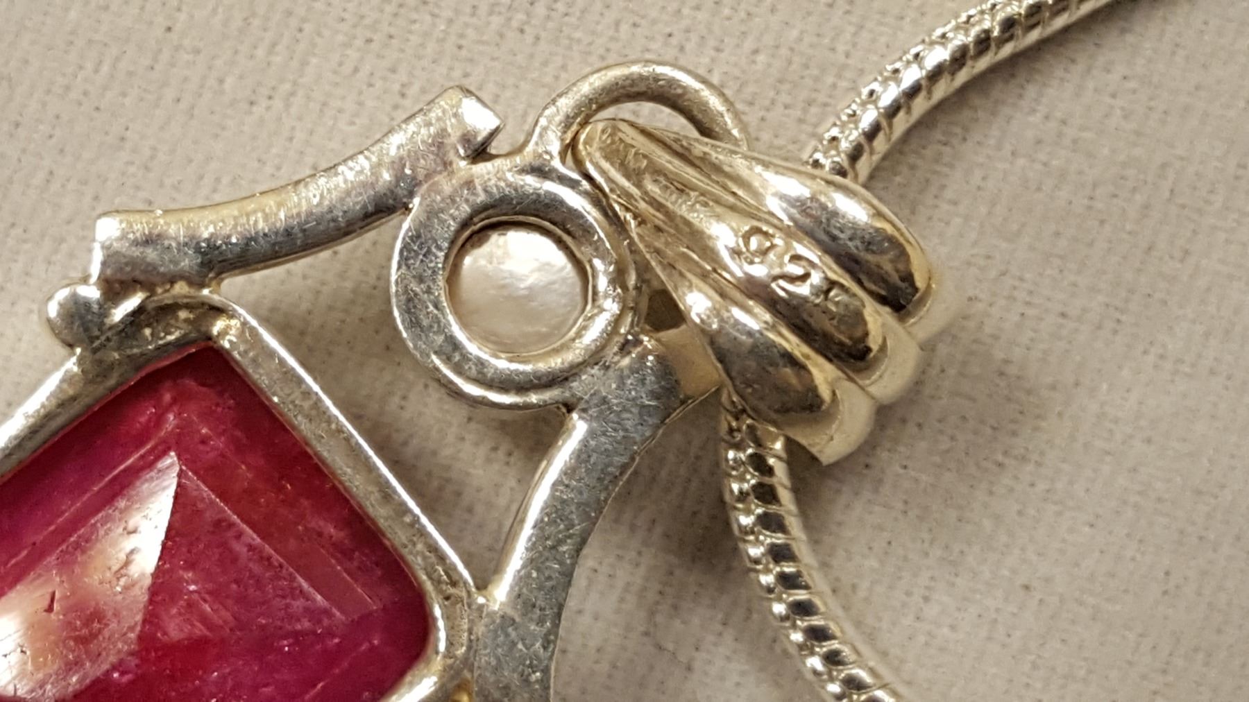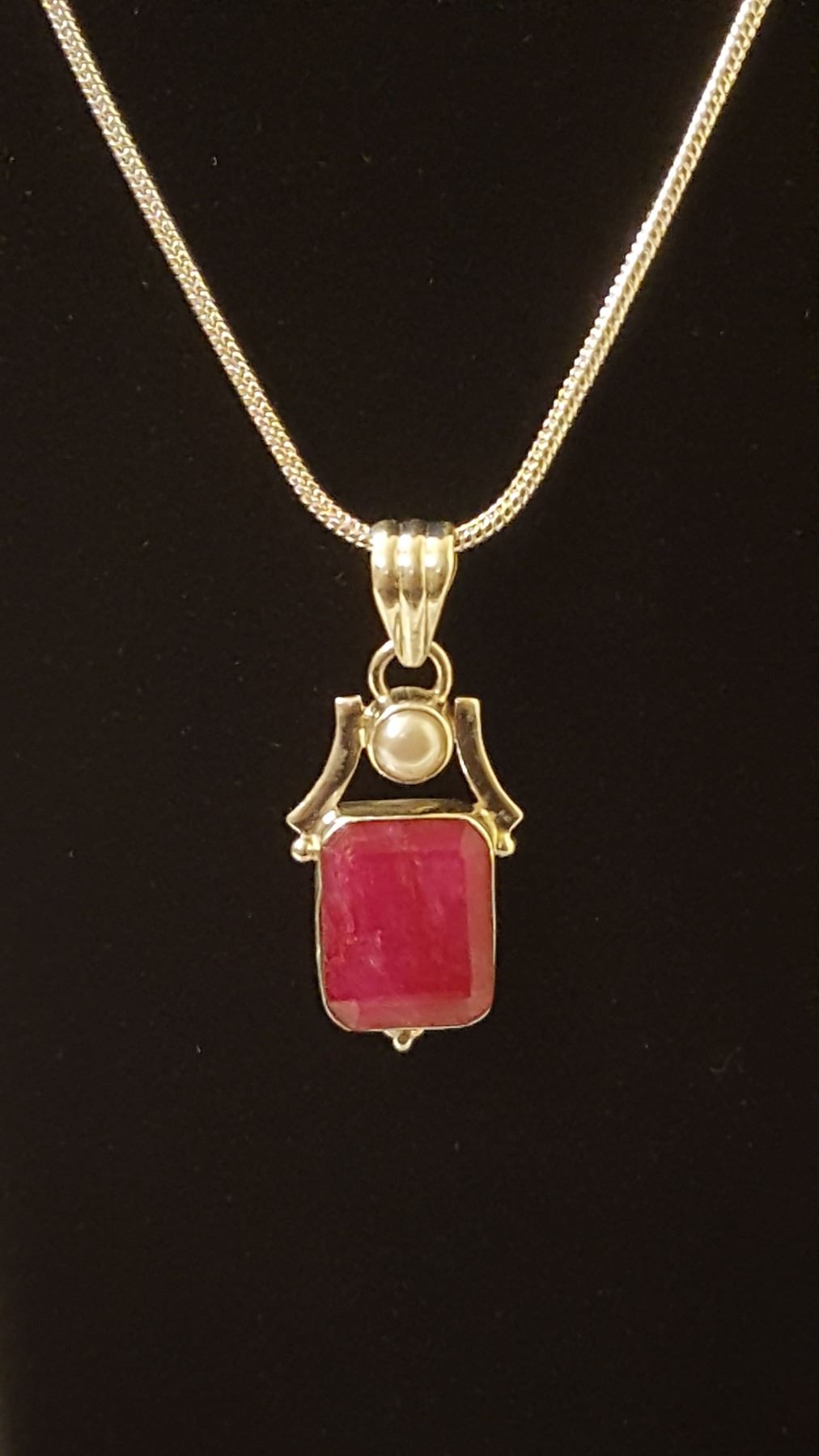 OUTSTANDING 9 CT RUBY PENDANT. INCLUDES PEARL ACCET. GORGEOUS DEEP BURGANDY HUE . MOUNTED .925 STERLING SILVER. INCLUDES 20" 2 mm CHAIN 72 CTTW.