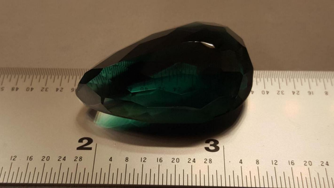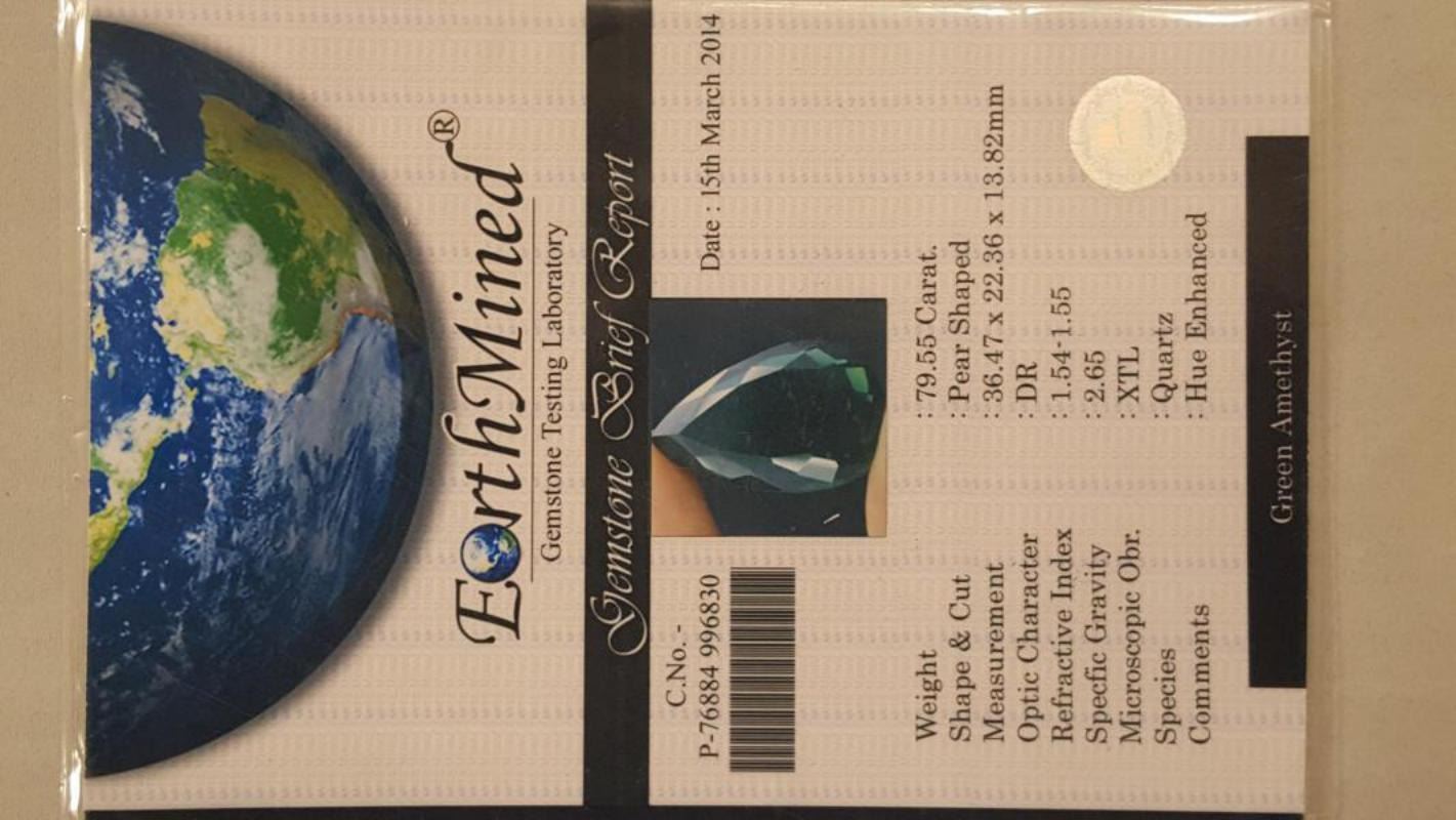 OUTSTANDING CERTIFIED 79.55 CT GREEN AMETHYST. DISPLAYING A GORGEOUS DEEP FOREST GREEN HUE ALONG WITH VIVID STRONG SATURATION AND CLARITY. EXCELLENT PEAR CUT. MEASURING 36.47 x 22.36 x 13.82 mm. NEAR FLAWLESS. ABSOLUTELY STUNNING. PLEASE SEE CERTIFICATION FOR FURTHER DETAILS .