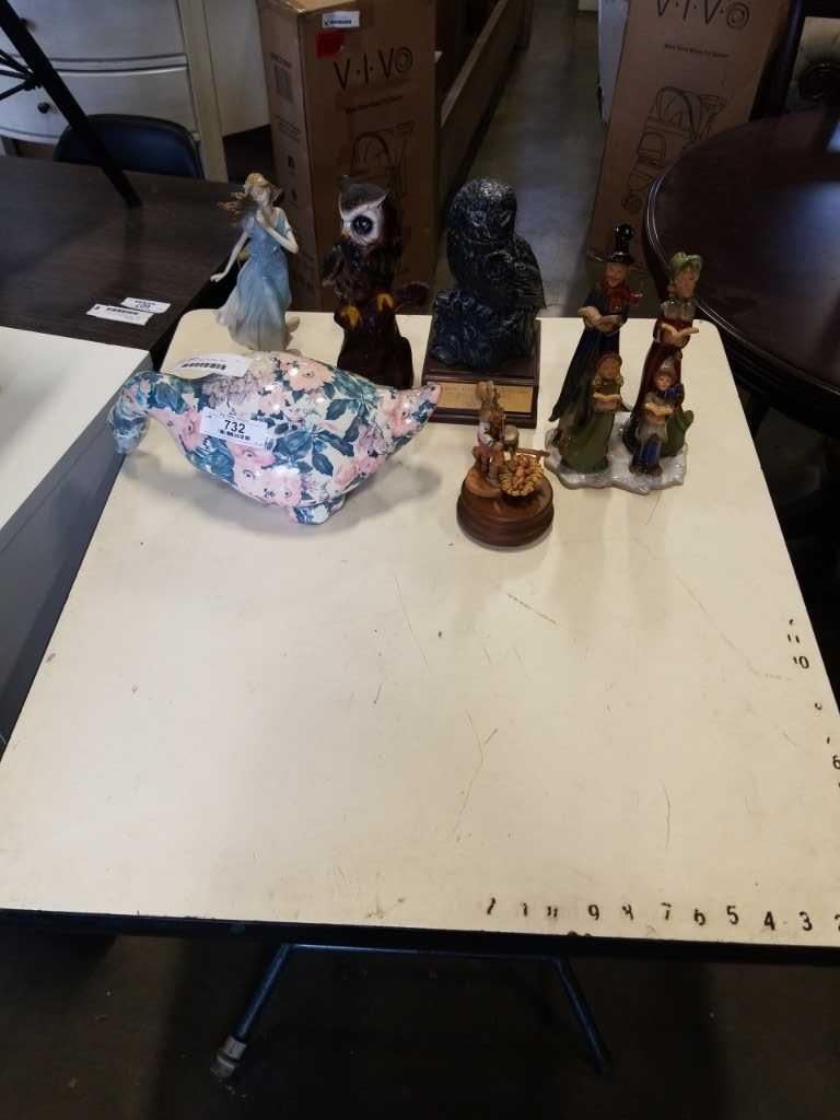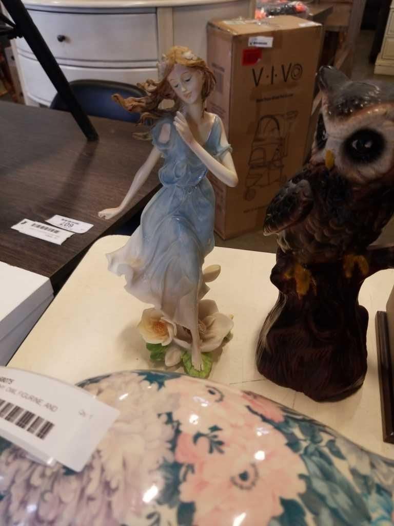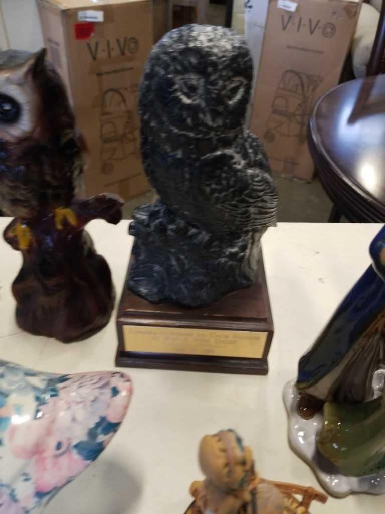 OWL TROPHY, OWL FIGURINE, AND ASSORTED VINTAGE AND ANTIQUE FIGURINES