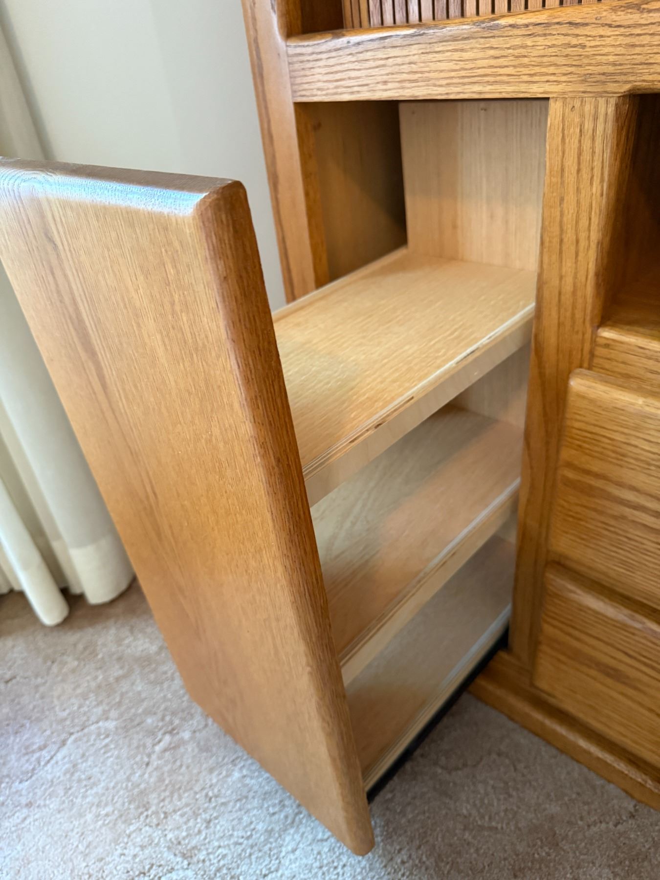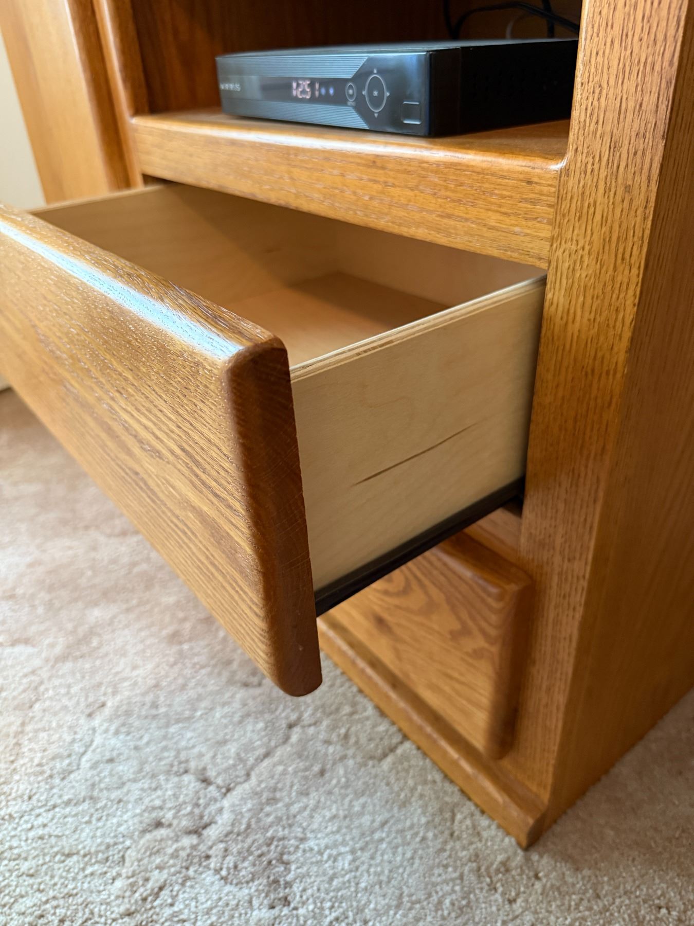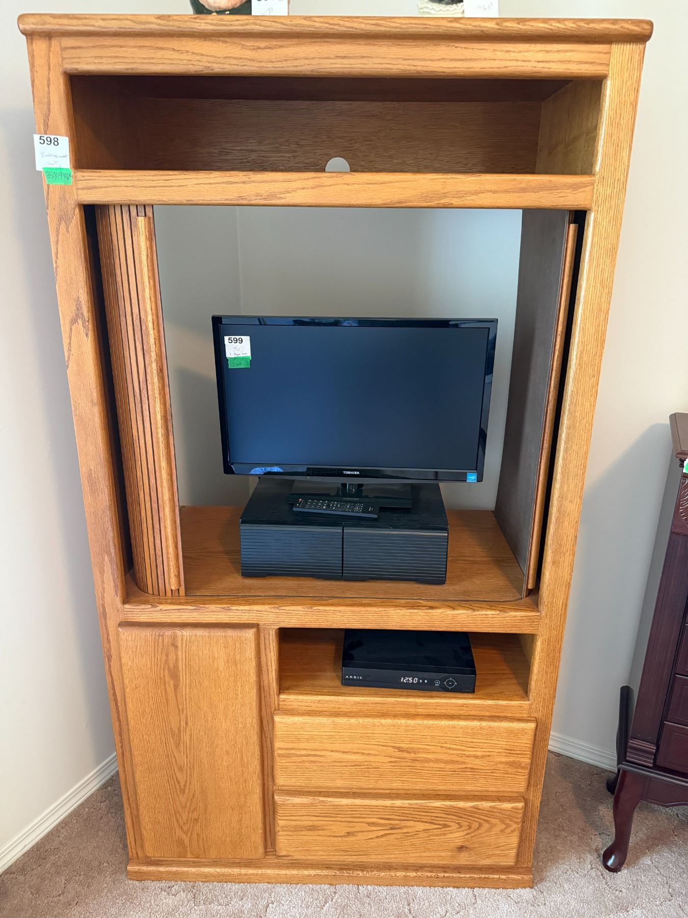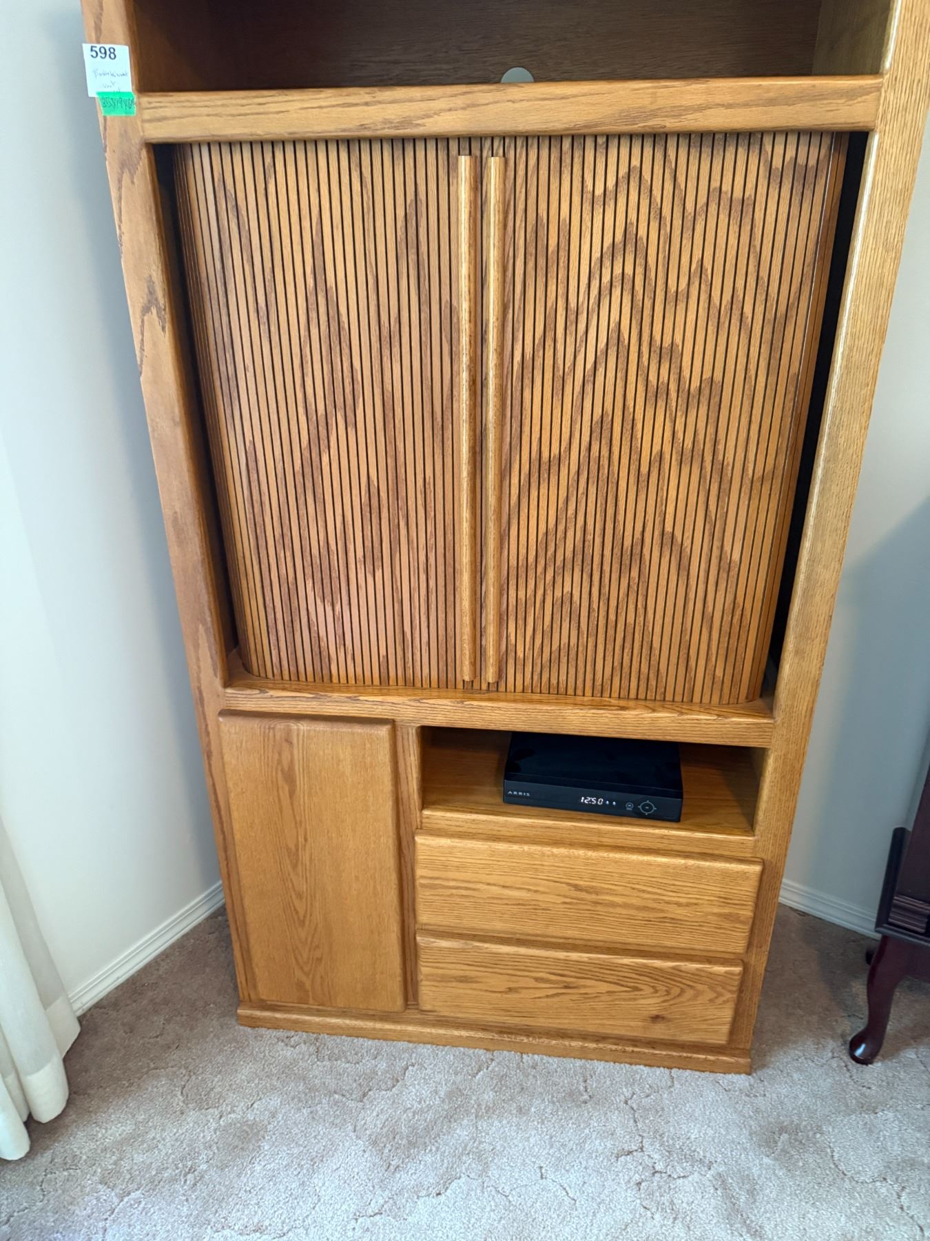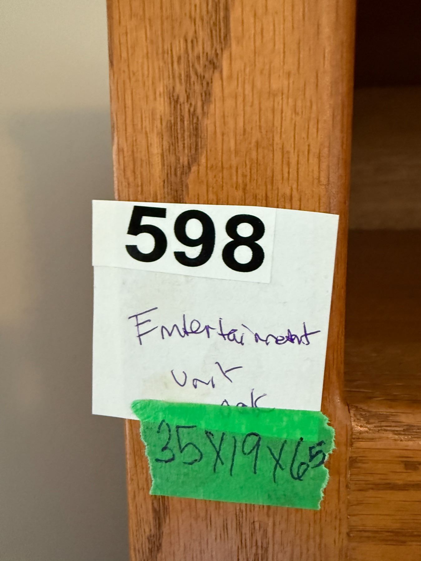 Entertainment Unit measures 35x19x65". Bring help. In bedroom 2.