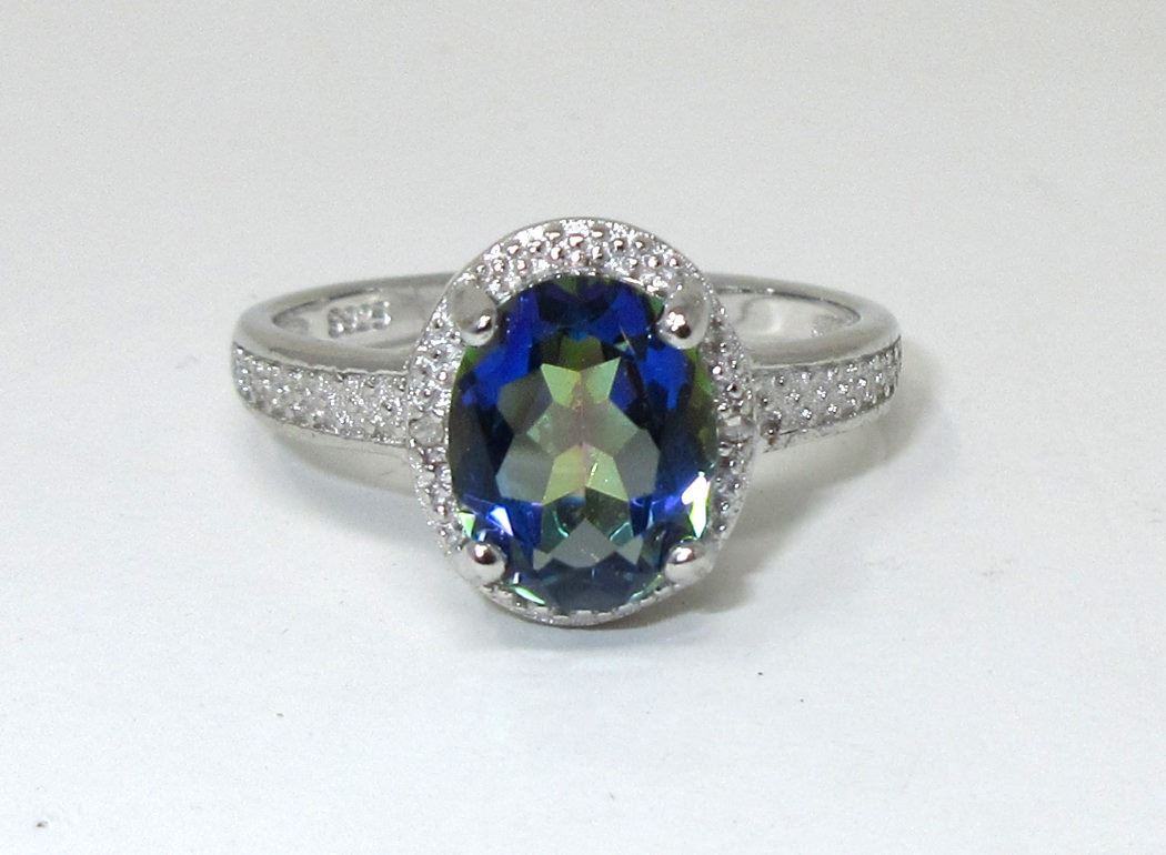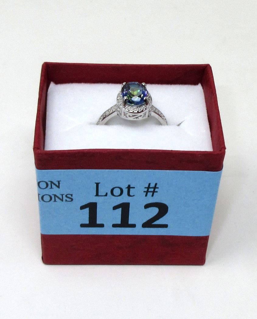 Sterling silver. 7 x 9 mm Oval topaz with 2 shoulder diamonds. Includes $275 certificate.