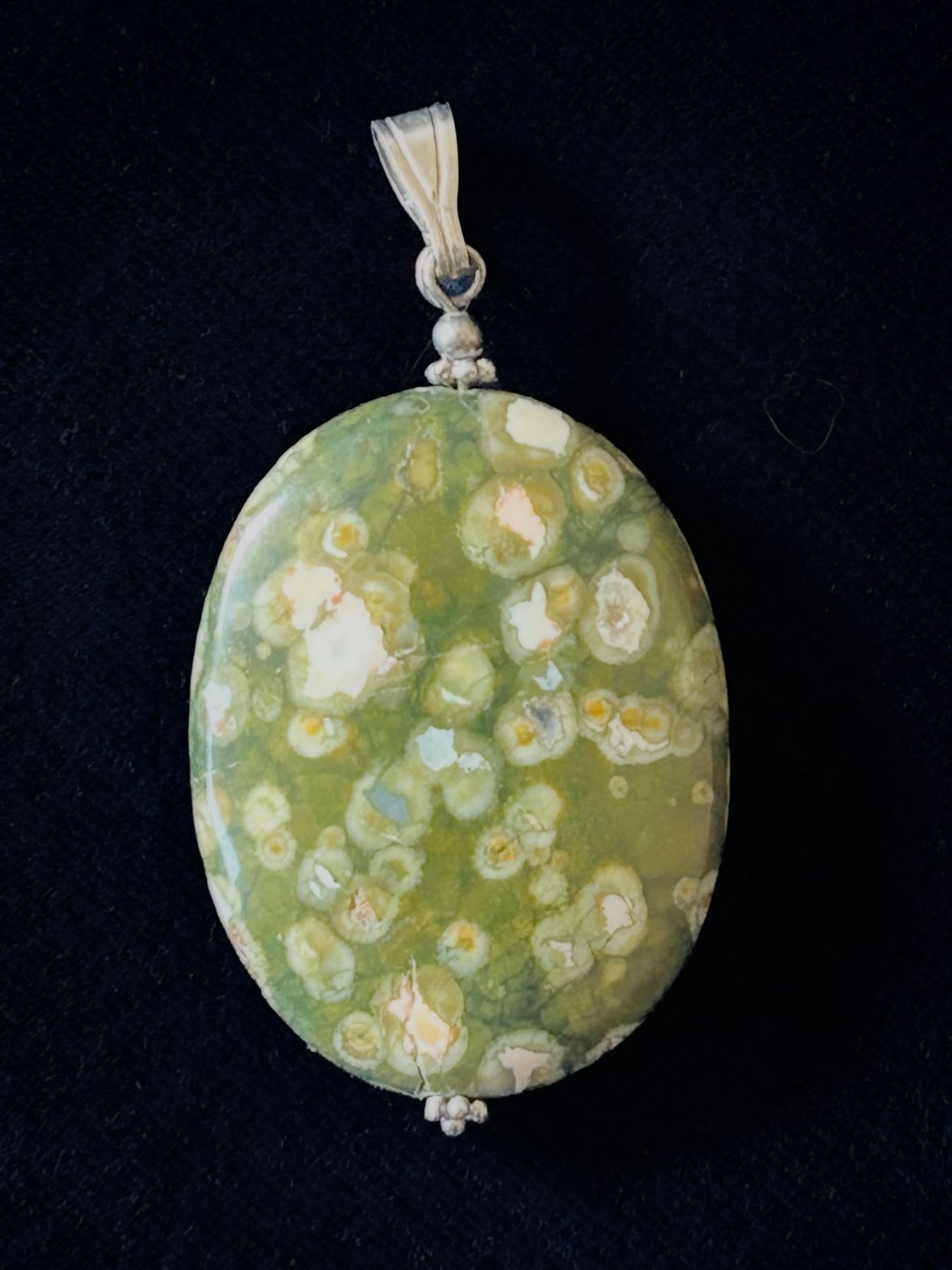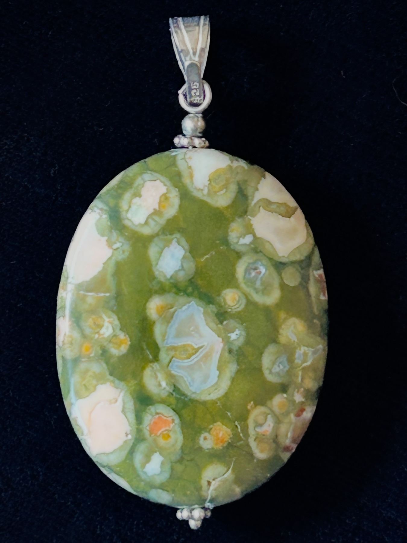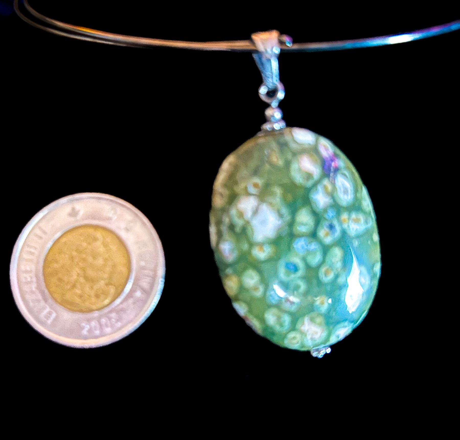 Polished oval ocean jasper pendant in rich green tones with distinctive orbicular patterns, set on a stamped 925 sterling silver bail. A natural statement piece with organic texture and soothing colors. Shown beside a toonie for scale and on choker - for scale and display only (not included).