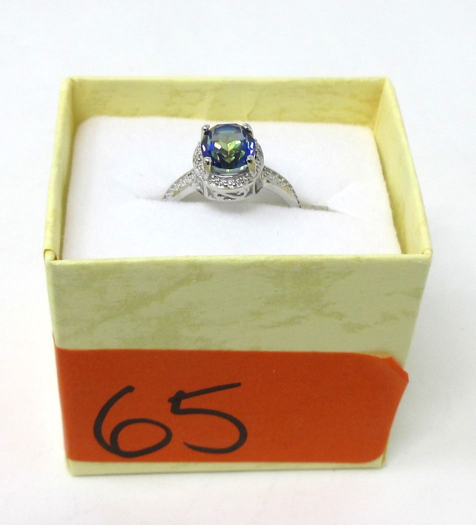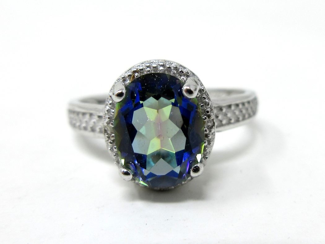 2 Diamonds. 2.50 CT Oval Shaped Topaz. Sterling Silver with Platinum overlay. With $275 Certificate
