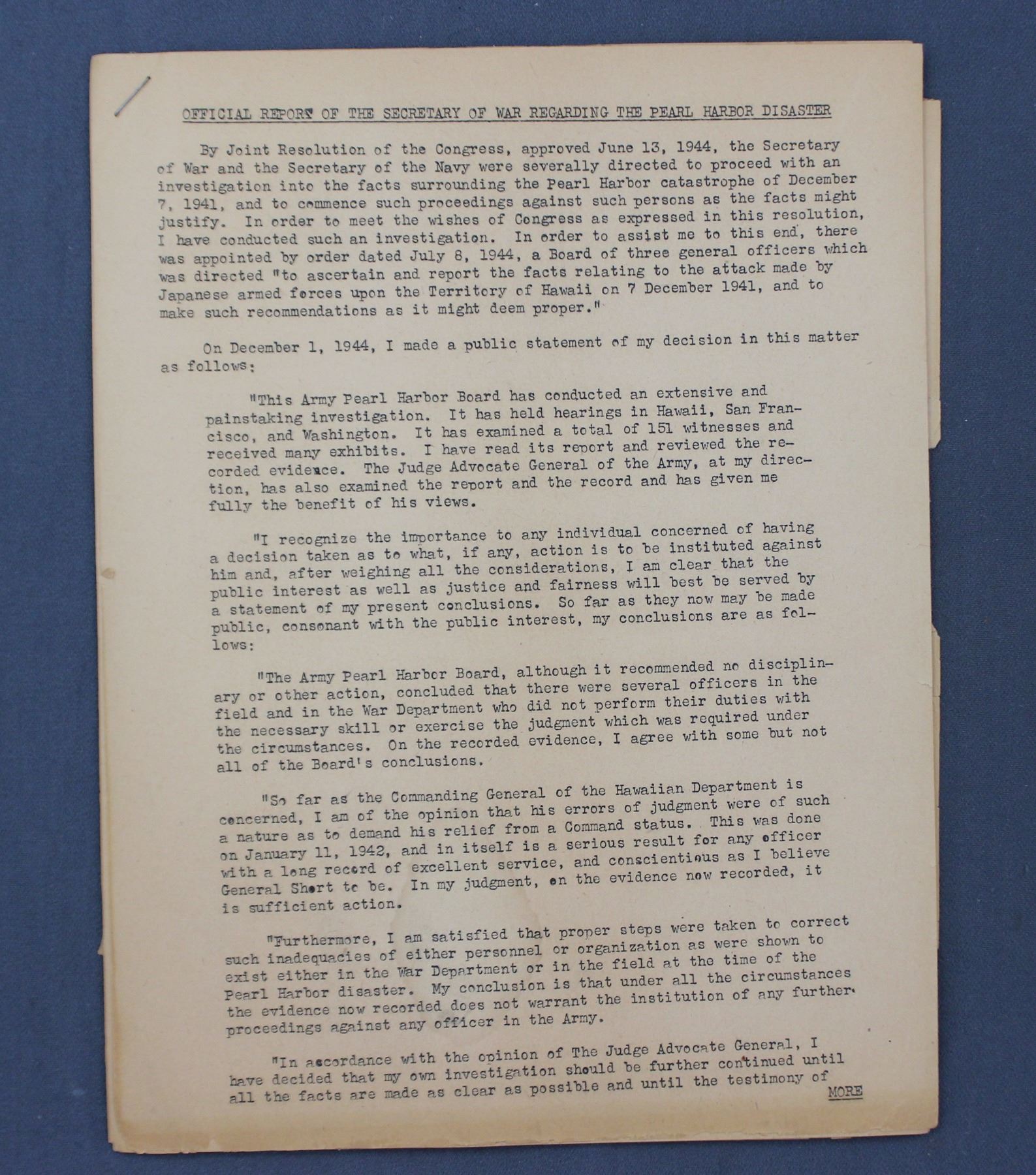 Official Report of the Secretary of War Regarding the Pearl Harbor Disaster, publ. 1944.