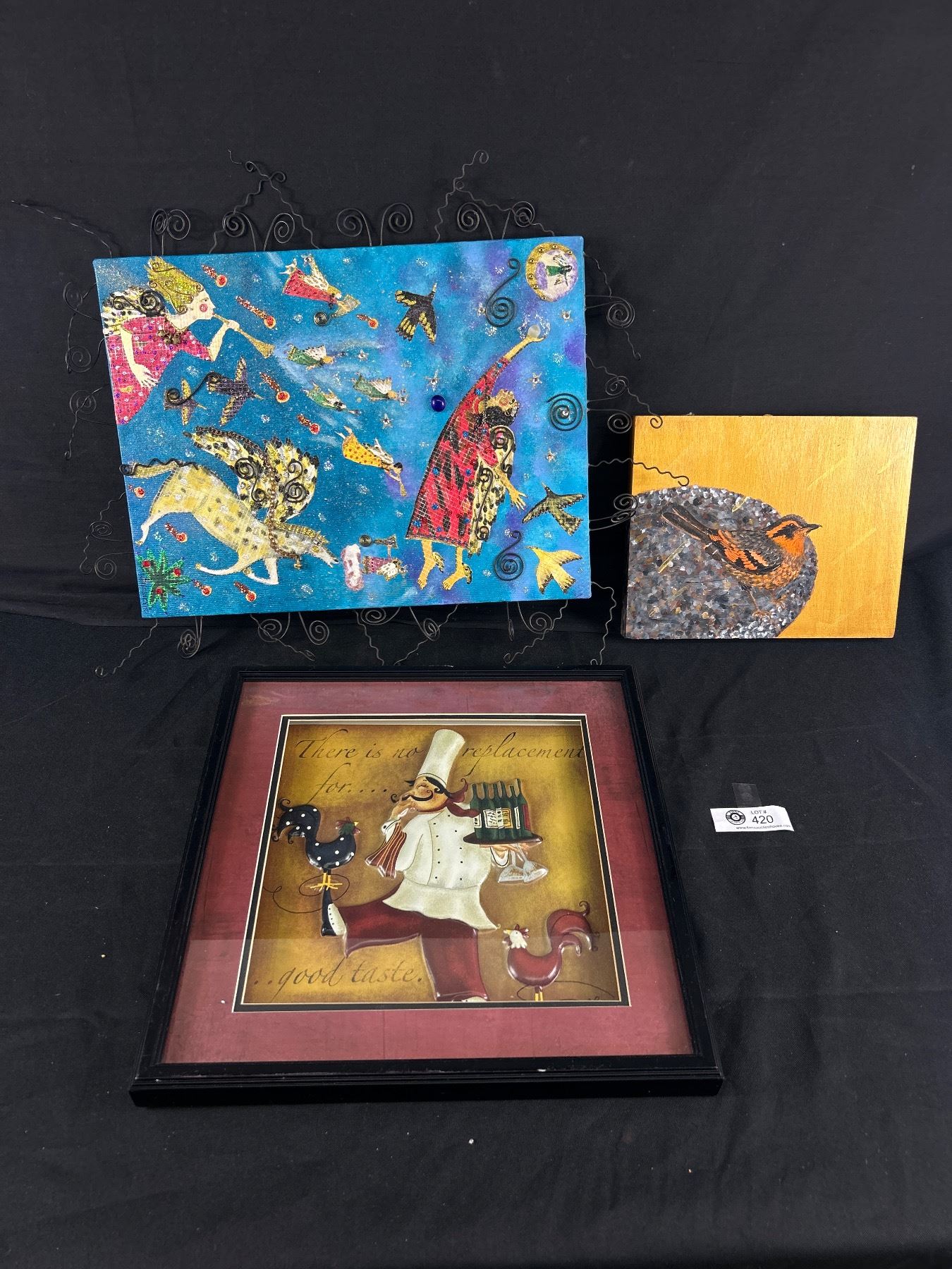 Oil Painted Thrush On Wood, Whimsical T.Hennessey Angel Art On Canvas & Framed Good Taste Sign