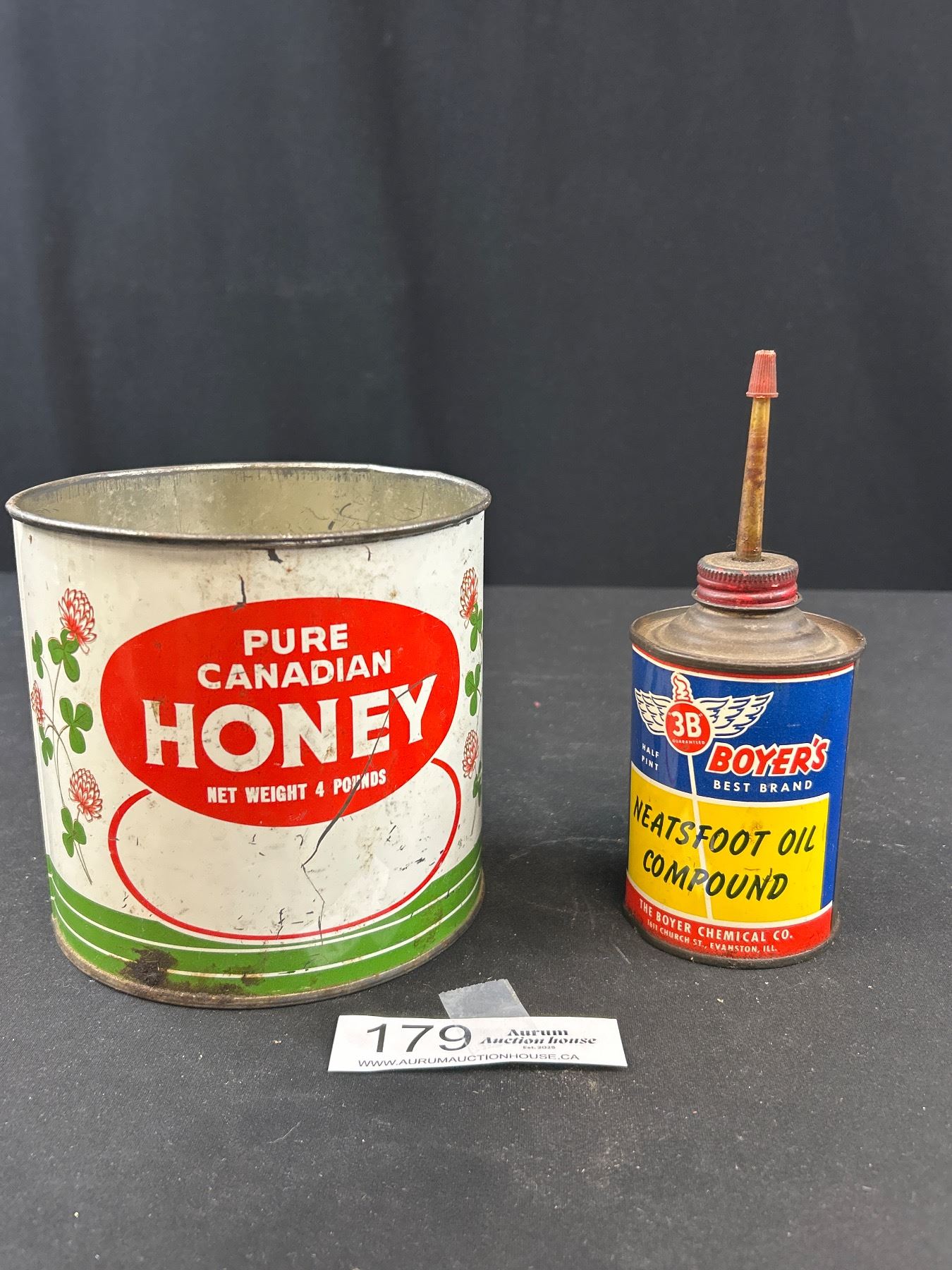 Old 3B Boyers Neatsfoot Oil Compound Tin + Pure Canadian 4lb Honey Tin w/ No Lid