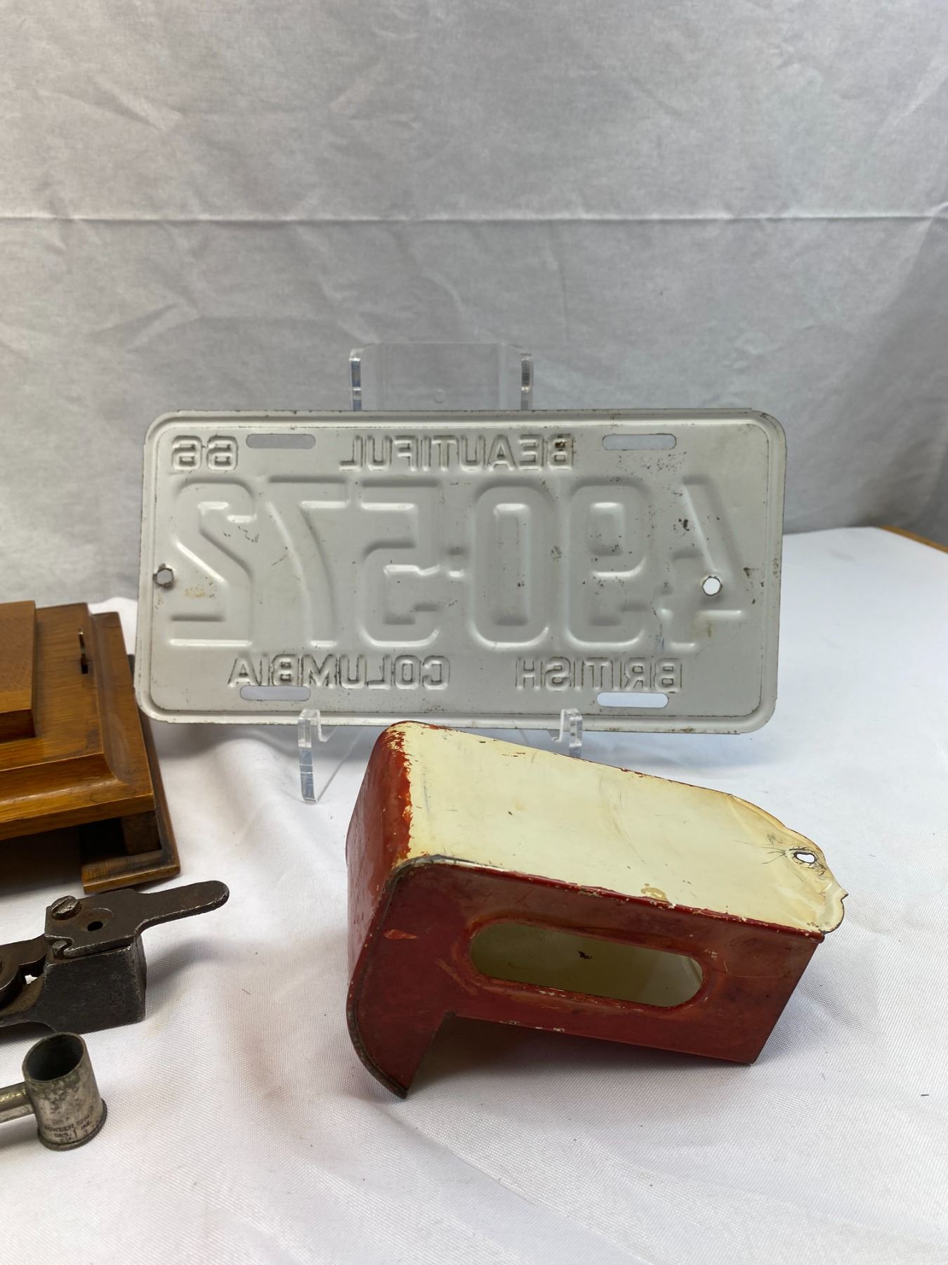 Old BC License Plate, Tools, Match Holder And Weather Station, Incomplete