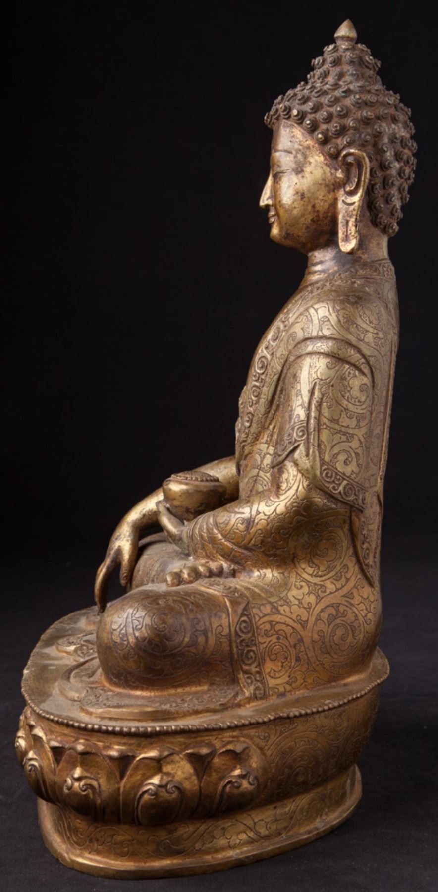 Old Buddha Statue....Material: Bronze;35 cm high;23 cm wide and 16 cm deepFire gilded with 24 krt. gold; Bhumisparsha Mudra......Origin - Nepal