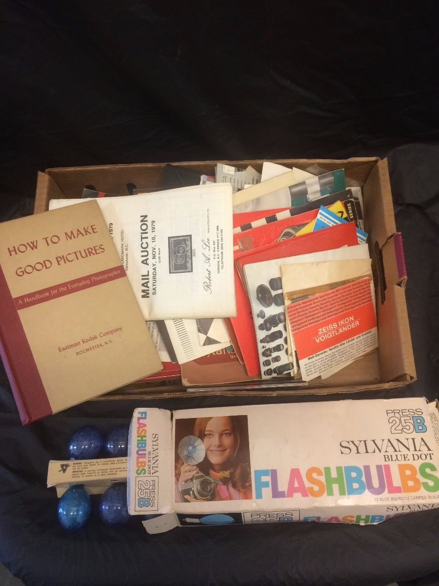 Manuals Books and vintage blue flash bulbs