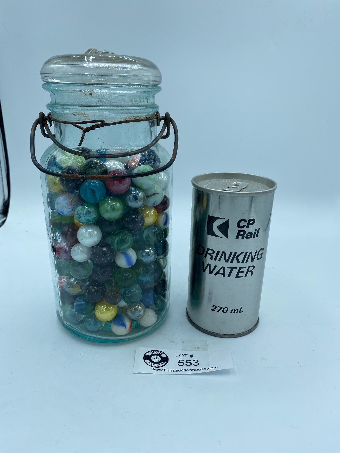 Old Canning Jar Full of Marbles and a Full CP Rail Drinking Water Can