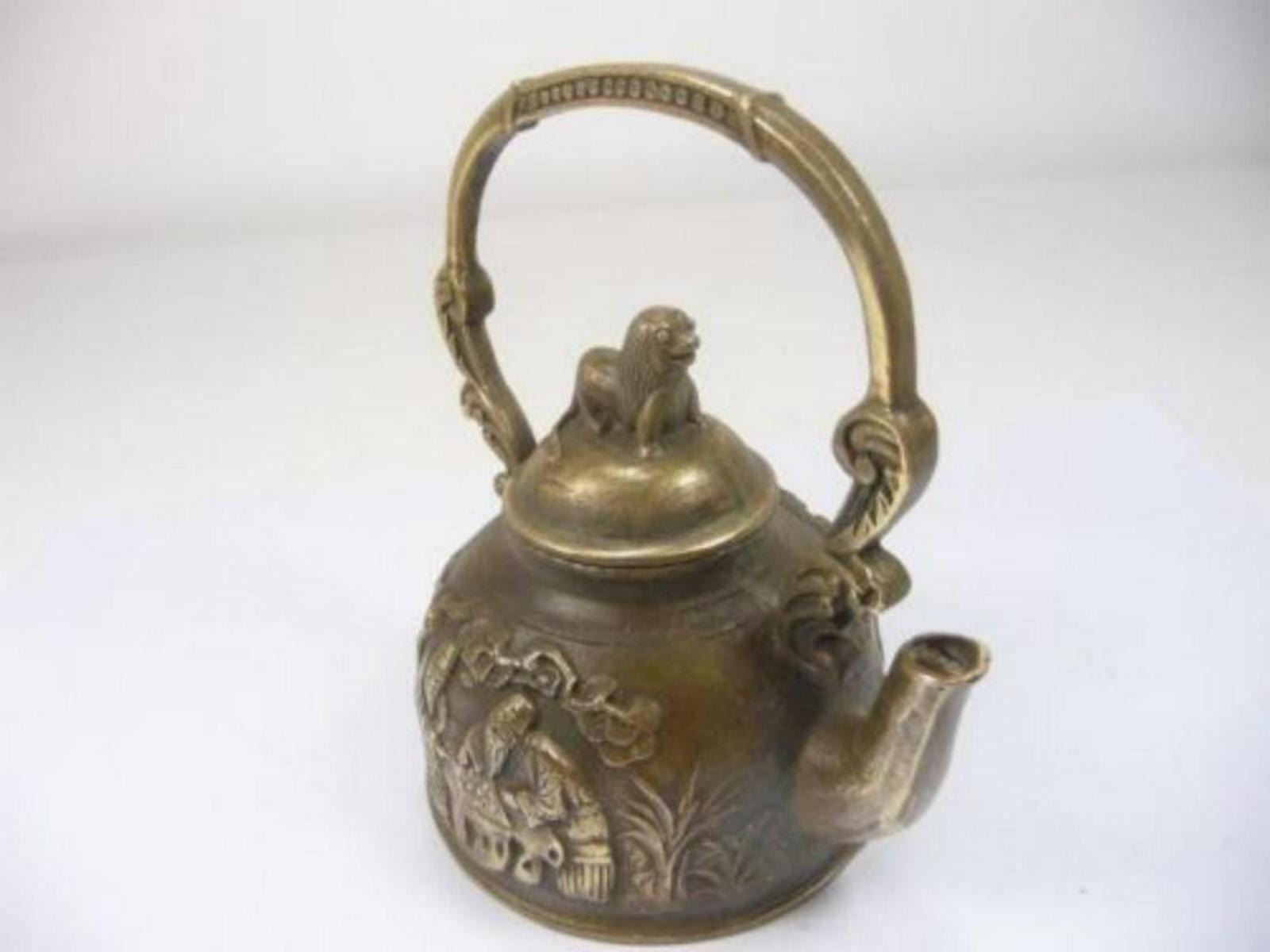 Description: Antique Chinese Copper Teapot/winepot;Material: Copper bronze;(L x W x H)Size: (10.8 X 8.2 X 11)CM